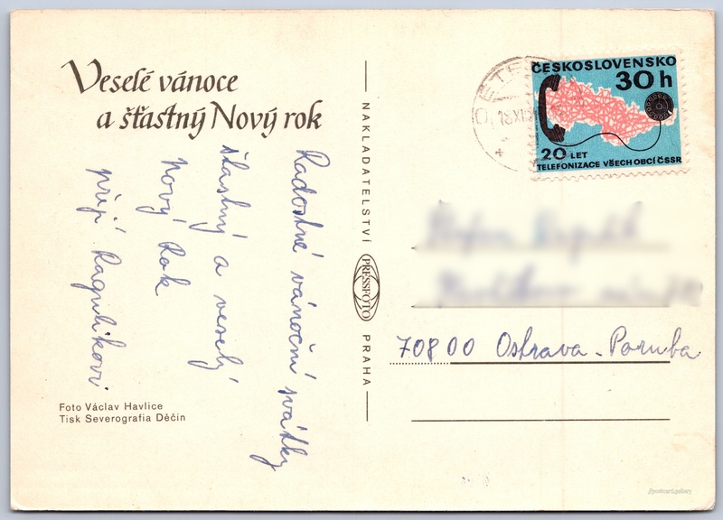 Vánoční a novoroční přání, hodiny Pokud chcete vidět pohlednice ve vyšším rozlišení nebo zobrazovat jejich zadní stranu, tak se prosím nejdříve přihlašte Přihlásit Zaregistrovat Veselé vánoce a šťastný Nový rok Jazyk tištěného textu na pohlednici: čeština Vydavatel: PressFoto Praha (Československo) Odhadované datum vydání pohlednice: 1974 - 1977 Pomozte nám zpřesnit rok vzniku pohlednice Velikost (š x v) a tvar pohlednice: 147 x 105 mm (5.79" x 4.13"), obdélník Osoby spjaté s touto pohlednicí: Václav Havlice(Autor fotografie) Prošlá poštou:Datum na razítku: 18.12.1977 Ceny: Vyplacené známky: 0,30 Kčs (CSK) DiskuseVložit příspěvek Přidat novou složku ... Spravovat složky ...