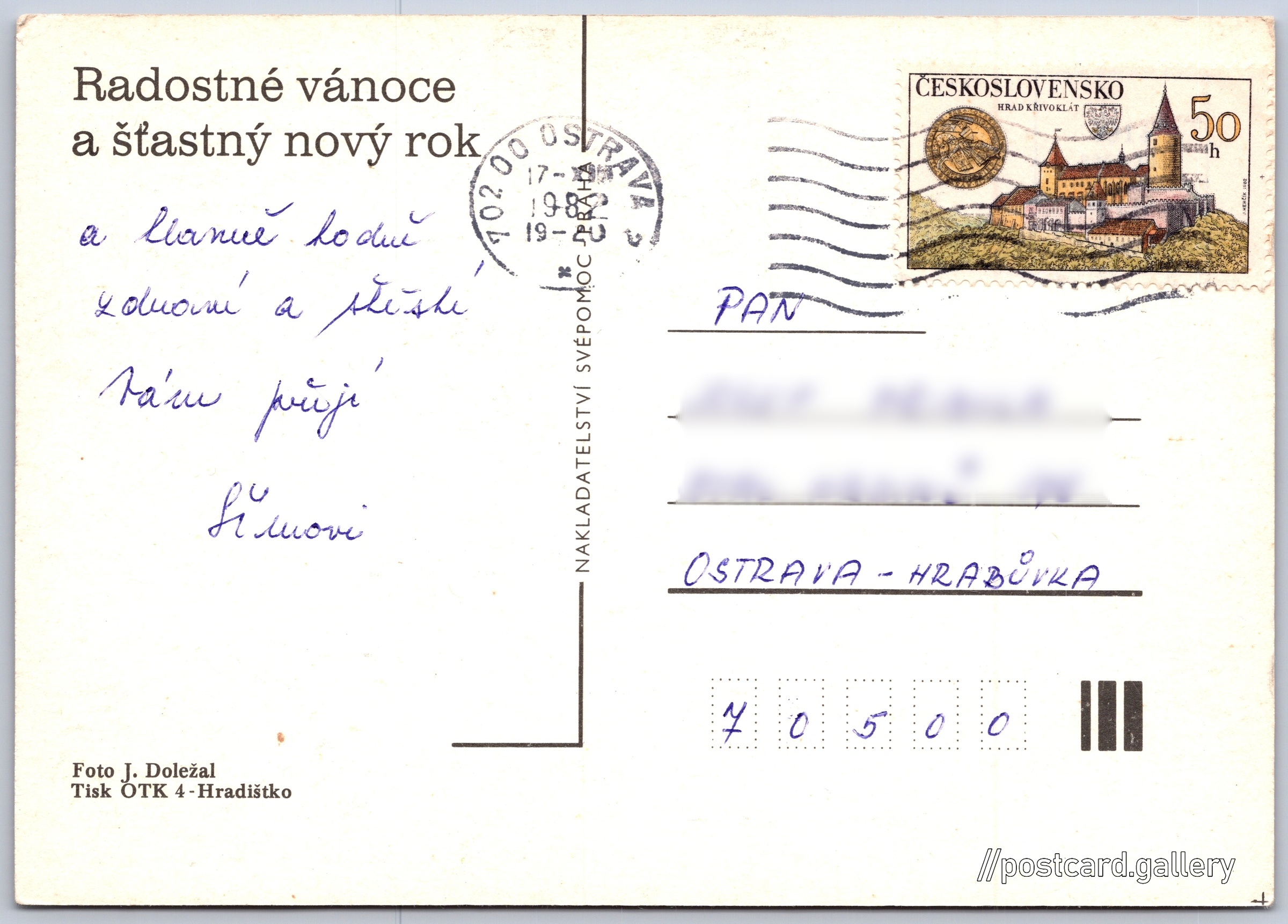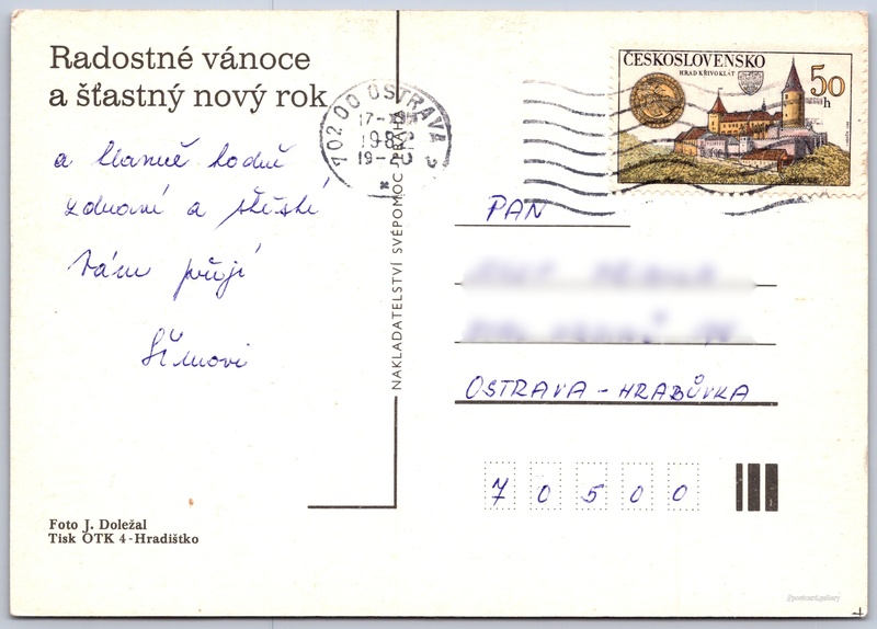 Vánoční a novoroční přání, hodiny Pokud chcete vidět pohlednice ve vyšším rozlišení nebo zobrazovat jejich zadní stranu, tak se prosím nejdříve přihlašte Přihlásit Zaregistrovat Radostné vánoce a šťastný nový rok Jazyk tištěného textu na pohlednici: čeština Vydavatel: Nakladatelství Svépomoc, Praha (Československo) Odhadované datum vydání pohlednice: 1978 - 1981 Pomozte nám zpřesnit rok vzniku pohlednice Velikost (š x v) a tvar pohlednice: 147 x 104 mm (5.79" x 4.09"), obdélník Osoby spjaté s touto pohlednicí: Jiří Doležal(Autor fotografie) Prošlá poštou:Datum na razítku: 17.12.1982 Ceny: Vyplacené známky: 0,50 Kčs (CSK) DiskuseVložit příspěvek Přidat novou složku ... Spravovat složky ...