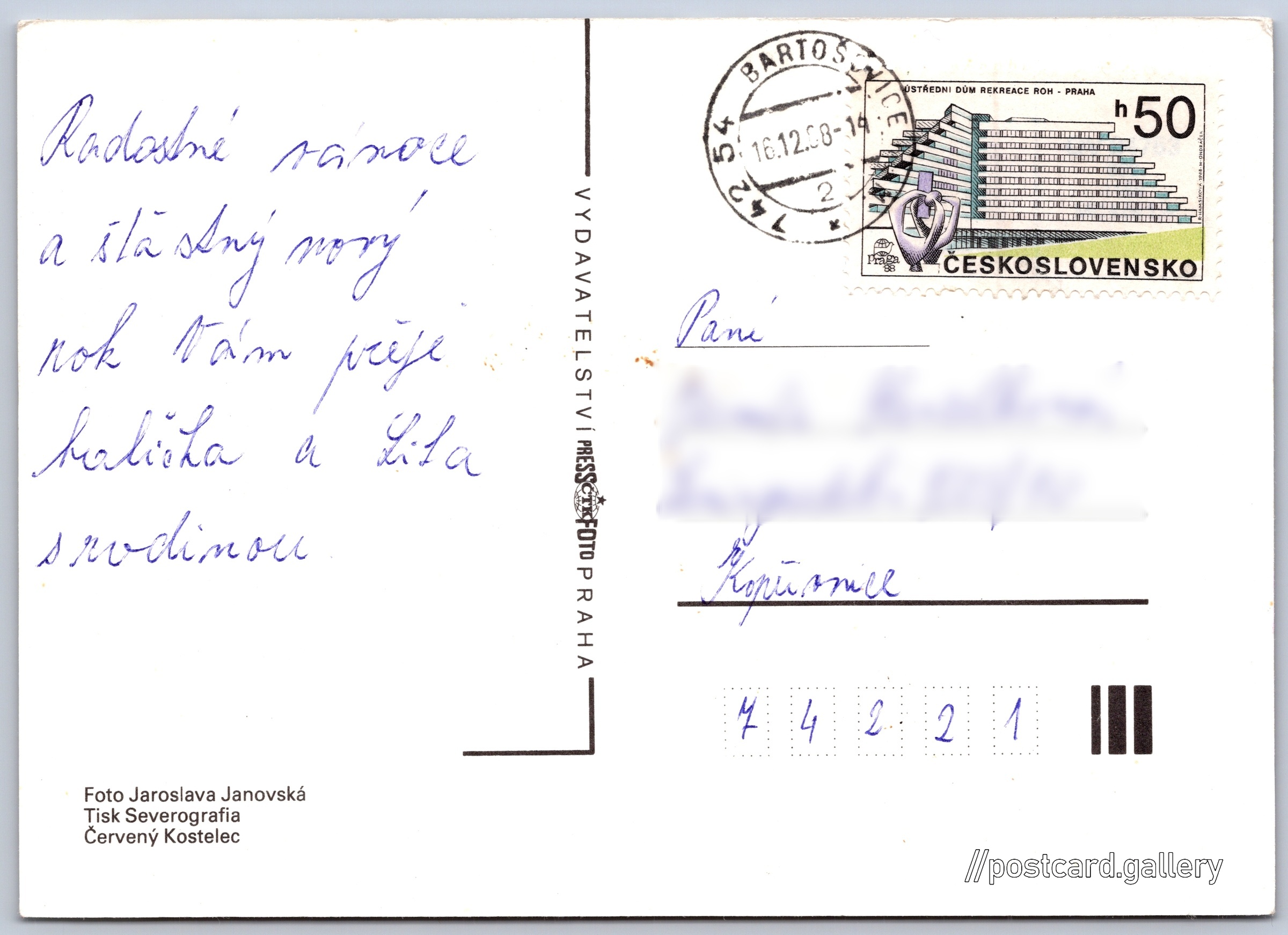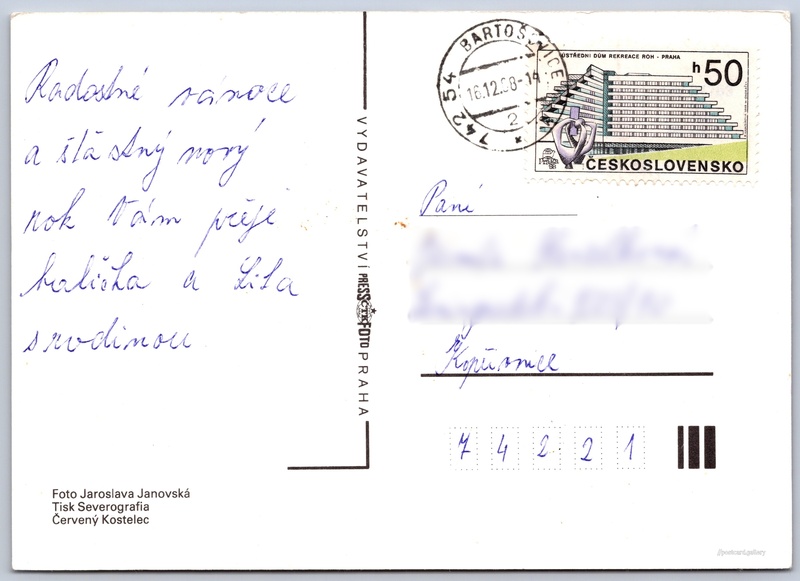 Vánoční a novoroční přání Pokud chcete vidět pohlednice ve vyšším rozlišení nebo zobrazovat jejich zadní stranu, tak se prosím nejdříve přihlašte Přihlásit Zaregistrovat Veselé vánoce a šťastný nový rok Jazyk tištěného textu na pohlednici: čeština Vydavatel: PressFoto Praha (Československo) Odhadované datum vydání pohlednice: 1985 - 1988 Pomozte nám zpřesnit rok vzniku pohlednice Velikost (š x v) a tvar pohlednice: 147 x 105 mm (5.79" x 4.13"), obdélník Osoby spjaté s touto pohlednicí: Jaroslava Janovská(Autor fotografie) Prošlá poštou:Datum na razítku: 16.12.1988 Ceny: Vyplacené známky: 0,50 Kčs (CSK) DiskuseVložit příspěvek Přidat novou složku ... Spravovat složky ...