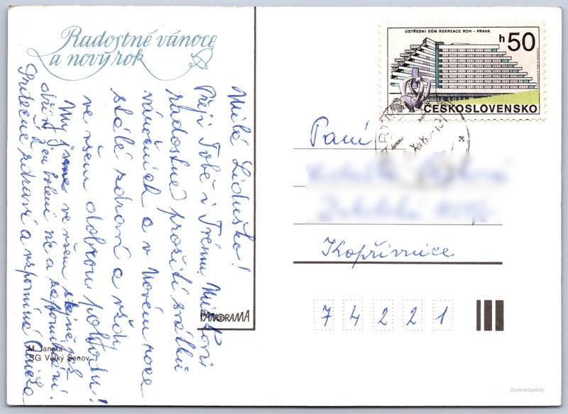 Vánoční a novoroční přání Pokud chcete vidět pohlednice ve vyšším rozlišení nebo zobrazovat jejich zadní stranu, tak se prosím nejdříve přihlašte Přihlásit Zaregistrovat Radostné vánoce a nový rok Jazyk tištěného textu na pohlednici: čeština Vydavatel: Panorama (Československo) Odhadované datum vydání pohlednice: 1985 - 1988 Pomozte nám zpřesnit rok vzniku pohlednice Velikost (š x v) a tvar pohlednice: 146 x 105 mm (5.75" x 4.13"), obdélník Osoby spjaté s touto pohlednicí: M. Janata(Autor fotografie) Prošlá poštou:Datum na razítku: 15.12.1988 Ceny: Vyplacené známky: 0,50 Kčs (CSK) DiskuseVložit příspěvek Přidat novou složku ... Spravovat složky ...