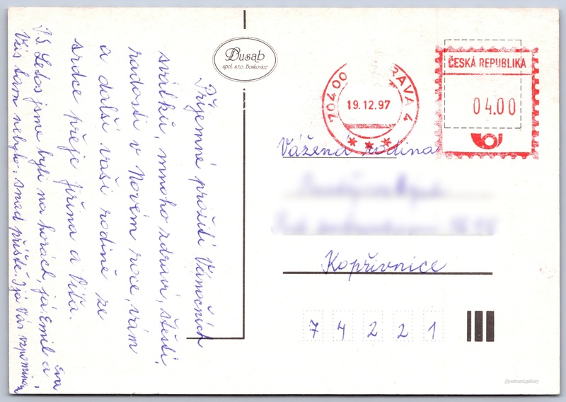 Vánoční a novoroční přání Pokud chcete vidět pohlednice ve vyšším rozlišení nebo zobrazovat jejich zadní stranu, tak se prosím nejdříve přihlašte Přihlásit Zaregistrovat Radostné vánoce a šťastný nový rok Jazyk tištěného textu na pohlednici: čeština Vydavatel: Dusab s.r.o. (Česko) Odhadované datum vydání pohlednice: 1994 - 1997 Pomozte nám zpřesnit rok vzniku pohlednice Velikost (š x v) a tvar pohlednice: 147 x 102 mm (5.79" x 4.02"), obdélník Prošlá poštou:Datum na razítku: 19.12.1997 Ceny: Vyplacené známky: 4,00 Kč (CZK) DiskuseVložit příspěvek Přidat novou složku ... Spravovat složky ...