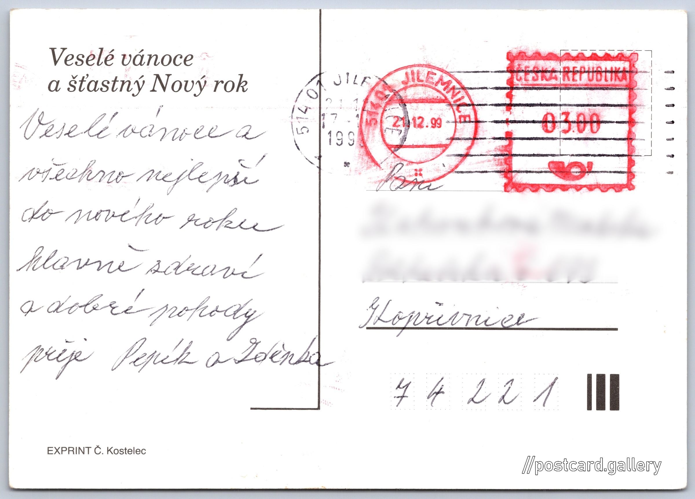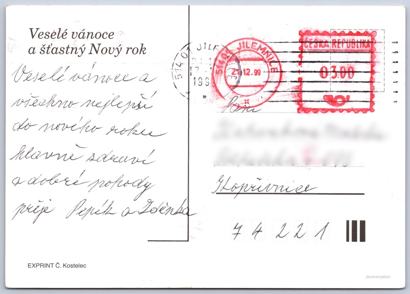 Vánoční a novoroční přání Pokud chcete vidět pohlednice ve vyšším rozlišení nebo zobrazovat jejich zadní stranu, tak se prosím nejdříve přihlašte Přihlásit Zaregistrovat Veselé vánoce a šťastný Nový rok Jazyk tištěného textu na pohlednici: čeština Odhadované datum vydání pohlednice: 1996 - 1999 Pomozte nám zpřesnit rok vzniku pohlednice Velikost (š x v) a tvar pohlednice: 148 x 105 mm (5.83" x 4.13"), obdélník Prošlá poštou:Datum na razítku: 17.12.1999 Ceny: Vyplacené známky: 3,00 Kč (CZK) DiskuseVložit příspěvek Přidat novou složku ... Spravovat složky ...