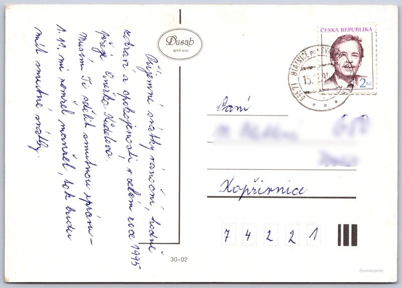 Vánoční a novoroční přání Pokud chcete vidět pohlednice ve vyšším rozlišení nebo zobrazovat jejich zadní stranu, tak se prosím nejdříve přihlašte Přihlásit Zaregistrovat Radostné vánoce a šťastný Nový rok Jazyk tištěného textu na pohlednici: čeština Vydavatel: Dusab s.r.o. (Česko) Odhadované datum vydání pohlednice: 1993 - 1994 Pomozte nám zpřesnit rok vzniku pohlednice Velikost (š x v) a tvar pohlednice: 146 x 103 mm (5.75" x 4.06"), obdélník Prošlá poštou:Datum na razítku: 15.12.1994 Ceny: Vyplacené známky: 2,00 Kč (CZK) Kódy na pohlednici: 30-02 DiskuseVložit příspěvek Přidat novou složku ... Spravovat složky ...
