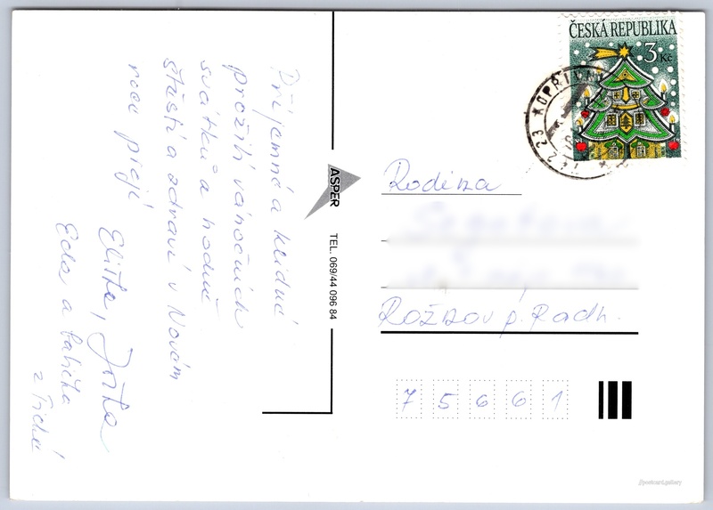 Vánoční a novoroční přání Pokud chcete vidět pohlednice ve vyšším rozlišení nebo zobrazovat jejich zadní stranu, tak se prosím nejdříve přihlašte Přihlásit Zaregistrovat Veselé Vánoce a Šťastný Nový rok Jazyk tištěného textu na pohlednici: čeština Vydavatel: ASPER (Československo) Odhadované datum vydání pohlednice: 1992 - 1995 Pomozte nám zpřesnit rok vzniku pohlednice Velikost (š x v) a tvar pohlednice: 148 x 105 mm (5.83" x 4.13"), obdélník Prošlá poštou:Datum na razítku: 18.12.1995 Ceny: Vyplacené známky: 3,00 Kč (CZK) DiskuseVložit příspěvek Přidat novou složku ... Spravovat složky ...