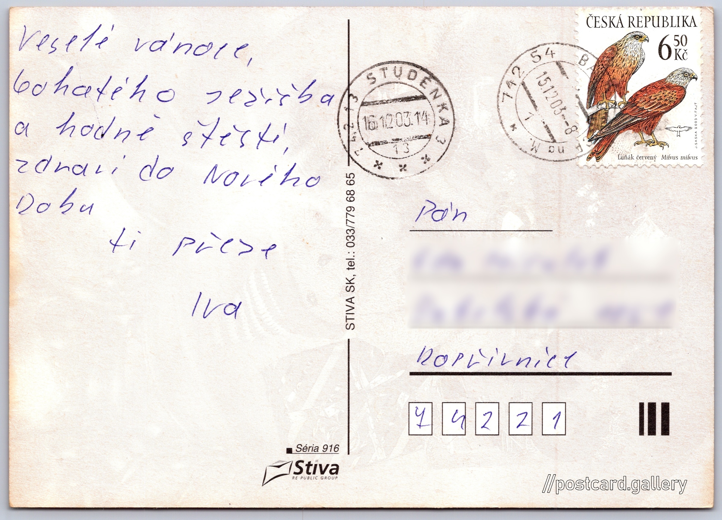 Vánoční a novoroční přání Pokud chcete vidět pohlednice ve vyšším rozlišení nebo zobrazovat jejich zadní stranu, tak se prosím nejdříve přihlašte Přihlásit Zaregistrovat Veselé Vánoce a šťastný nový rok Jazyk tištěného textu na pohlednici: čeština Vydavatel: STIVA SK (Slovensko) Odhadované datum vydání pohlednice: 2000 - 2003 Pomozte nám zpřesnit rok vzniku pohlednice Velikost (š x v) a tvar pohlednice: 148 x 105 mm (5.83" x 4.13"), obdélník Prošlá poštou:Datum na razítku: 15.12.2003 Ceny: Vyplacené známky: 6,50 Kč (CZK) Kódy na pohlednici: Séria 916 DiskuseVložit příspěvek Přidat novou složku ... Spravovat složky ...