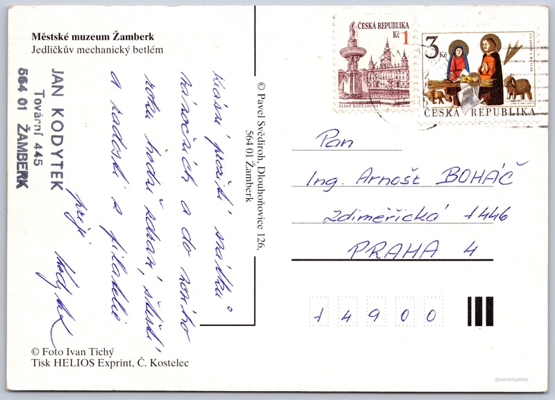 Vánoční pozdrav ze Žamberka Pokud chcete vidět pohlednice ve vyšším rozlišení nebo zobrazovat jejich zadní stranu, tak se prosím nejdříve přihlašte Přihlásit Zaregistrovat Vánoční pozdrav ze Žamberka Městské muzeum ŽamberkJedličkův mechanický betlém Jazyk tištěného textu na pohlednici: čeština Městské muzeum Žamberk, Muzeum, Čs. armády 472, Žamberk, Česko ukázat na mapě V blízkém okolí místa zobrazeného na pohlednici lze najít 1 jinou pohlednici. Zobrazit blízké pohlednice Datum vydání není známo Pomozte nám odhadnout datum vzniku pohlednice Velikost (š x v) a tvar pohlednice: 147 x 105 mm (5.79" x 4.13"), obdélník Osoby spjaté s touto pohlednicí: Ivan Tichý(Autor fotografie) Prošlá poštou Ceny: Vyplacené známky: 4,00 Kč (CZK) DiskuseVložit příspěvek Přidat novou složku ... Spravovat složky ...