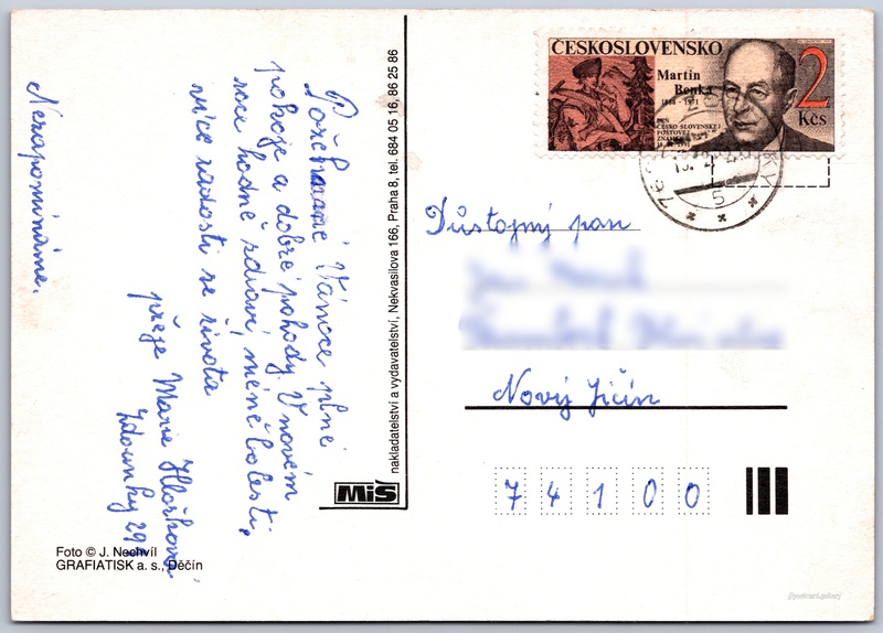 Vánoční přání, baňky Pokud chcete vidět pohlednice ve vyšším rozlišení nebo zobrazovat jejich zadní stranu, tak se prosím nejdříve přihlašte Přihlásit Zaregistrovat Jazyk tištěného textu na pohlednici: čeština Vydavatel: MiŠ nakladatelství a vydavatelství (Československo) Odhadované datum vydání pohlednice: 1991 - 1992 Pomozte nám zpřesnit rok vzniku pohlednice Velikost (š x v) a tvar pohlednice: 148 x 104 mm (5.83" x 4.09"), obdélník Osoby spjaté s touto pohlednicí: Jiří Nechvíl(Autor fotografie) Prošlá poštou Ceny: Vyplacené známky: 2,00 Kčs (CSK) DiskuseVložit příspěvek Přidat novou složku ... Spravovat složky ...