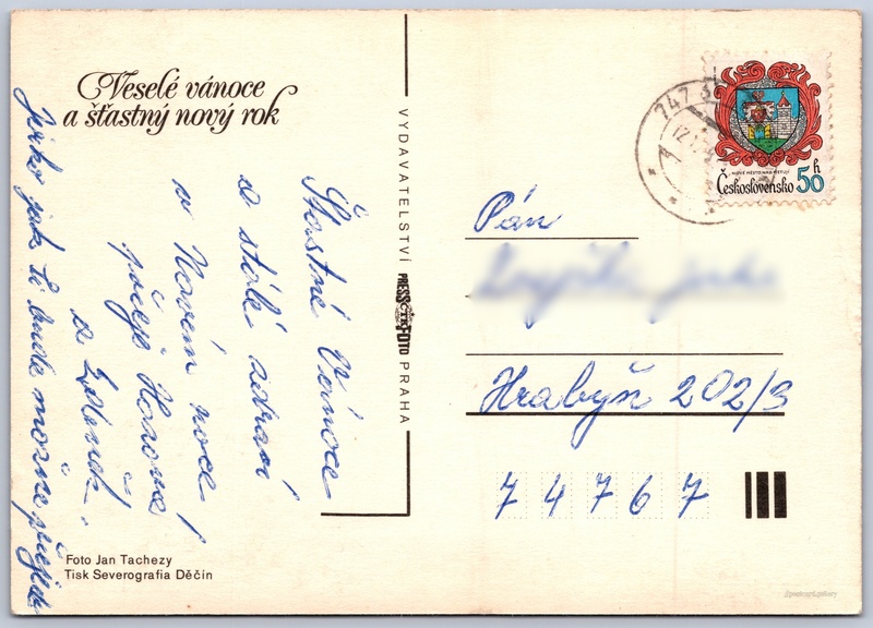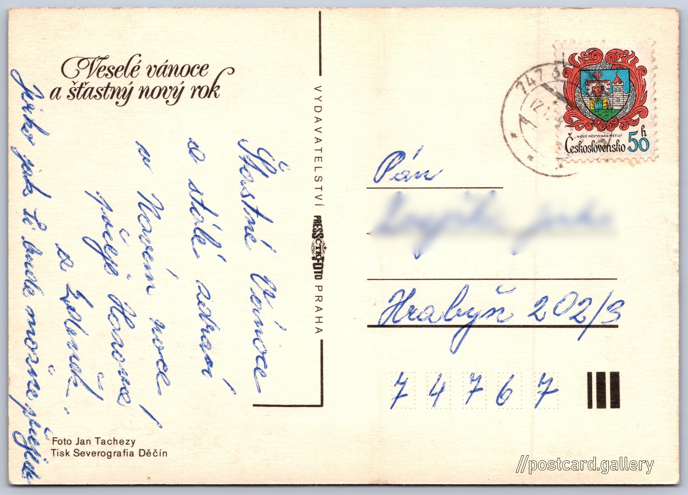 Vánoční přání, hořící svíčka, baňky Pokud chcete vidět pohlednice ve vyšším rozlišení nebo zobrazovat jejich zadní stranu, tak se prosím nejdříve přihlašte Přihlásit Zaregistrovat Veselé vánoce a šťastný nový rok Jazyk tištěného textu na pohlednici: čeština Vydavatel: PressFoto Praha (Československo) Datum vydání není známo Pomozte nám odhadnout datum vzniku pohlednice Velikost (š x v) a tvar pohlednice: 147 x 104 mm (5.79" x 4.09"), obdélník Osoby spjaté s touto pohlednicí: Jan Tachezy(Autor fotografie) Prošlá poštou Ceny: Vyplacené známky: 0,50 Kčs (CSK) DiskuseVložit příspěvek Přidat novou složku ... Spravovat složky ...