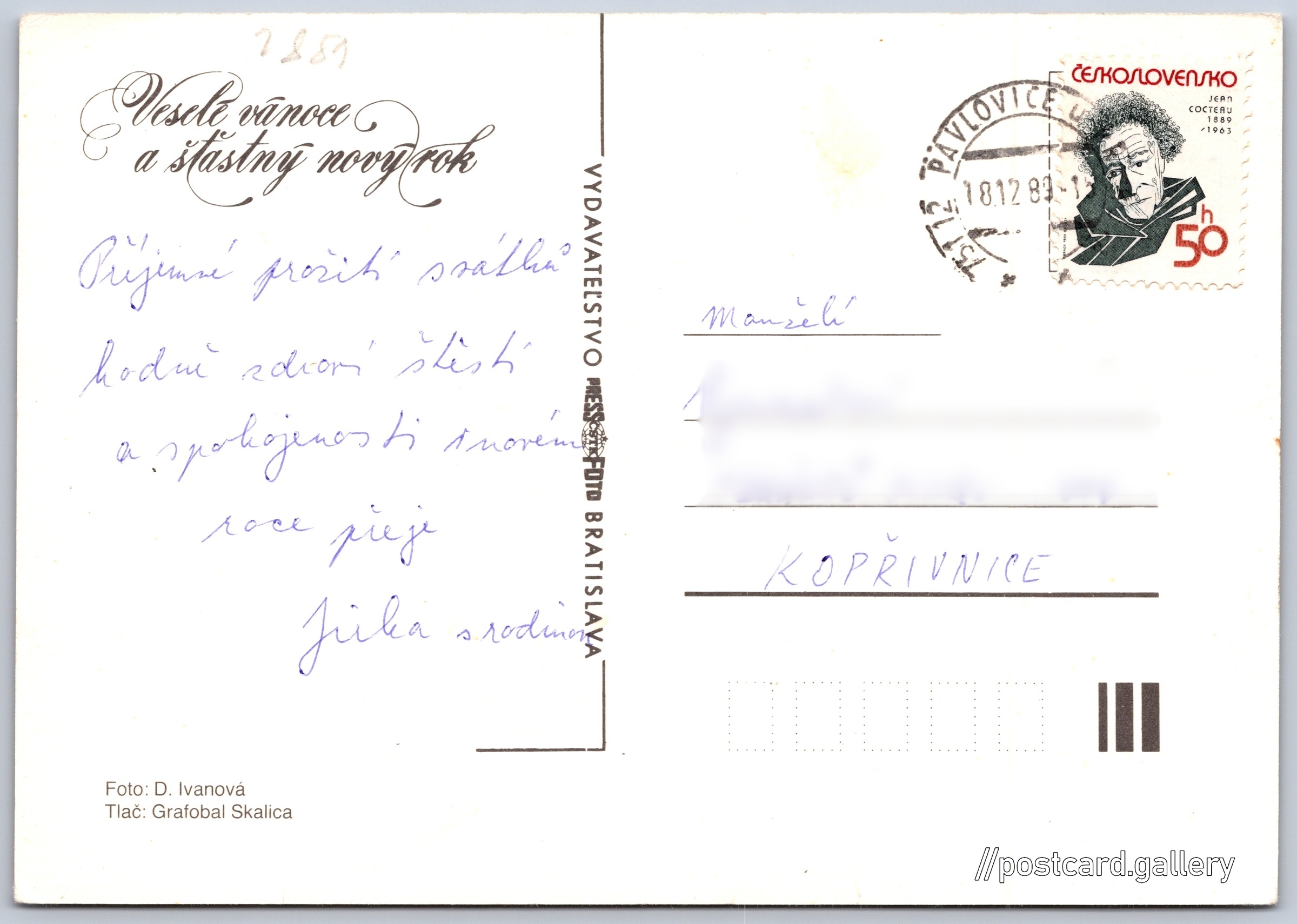 Vánoční přání, hořící svíčka Pokud chcete vidět pohlednice ve vyšším rozlišení nebo zobrazovat jejich zadní stranu, tak se prosím nejdříve přihlašte Přihlásit Zaregistrovat Veselé vánoce a šťastný nový rok Jazyk tištěného textu na pohlednici: čeština Vydavatel: PressFoto Bratislava (Československo) Odhadované datum vydání pohlednice: 1986 - 1989 Pomozte nám zpřesnit rok vzniku pohlednice Velikost (š x v) a tvar pohlednice: 147 x 103 mm (5.79" x 4.06"), obdélník Osoby spjaté s touto pohlednicí: D. Ivanová(Autor fotografie) Prošlá poštou:Datum na razítku: 18.12.1989 Ceny: Vyplacené známky: 0,50 Kčs (CSK) DiskuseVložit příspěvek Přidat novou složku ... Spravovat složky ...