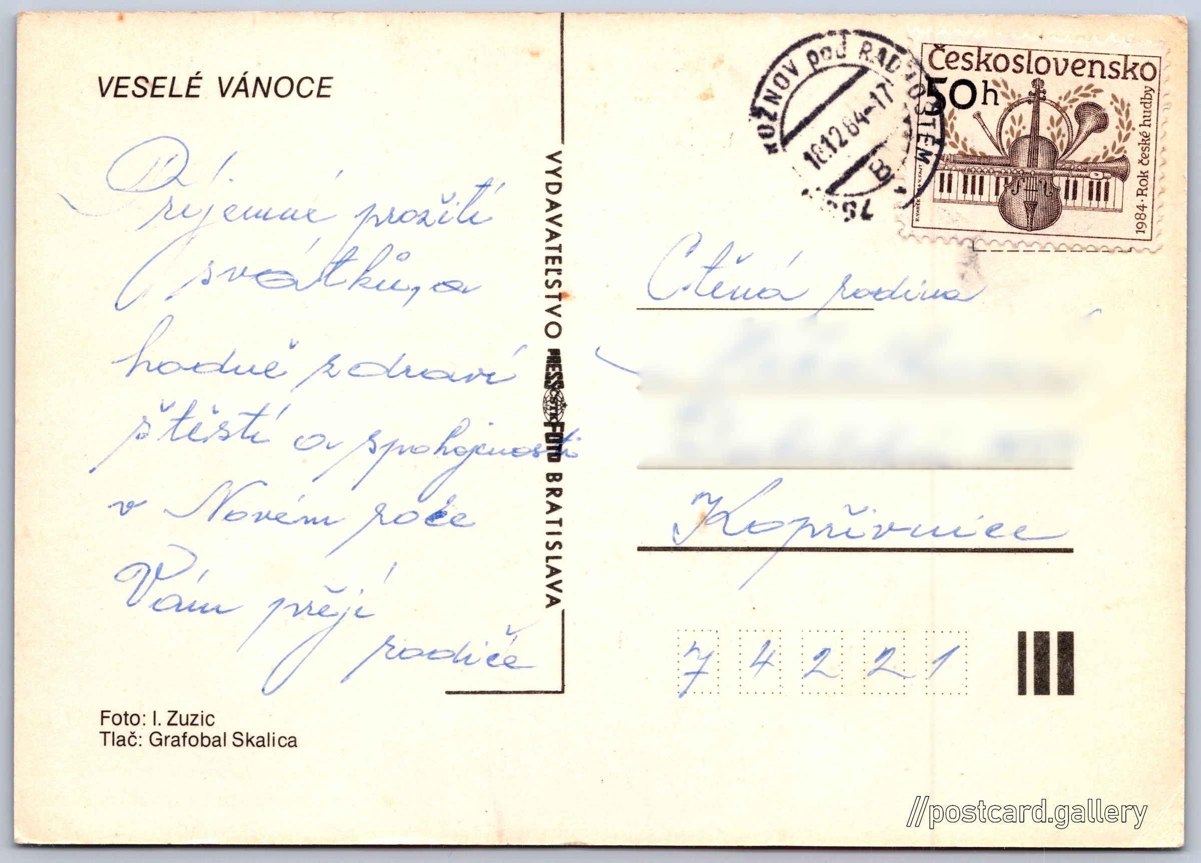 Vánoční přání Pokud chcete vidět pohlednice ve vyšším rozlišení nebo zobrazovat jejich zadní stranu, tak se prosím nejdříve přihlašte Přihlásit Zaregistrovat VESELÉ VÁNOCE Jazyk tištěného textu na pohlednici: čeština Vydavatel: PressFoto Bratislava (Československo) Odhadované datum vydání pohlednice: 1981 - 1984 Pomozte nám zpřesnit rok vzniku pohlednice Velikost (š x v) a tvar pohlednice: 148 x 105 mm (5.83" x 4.13"), obdélník Osoby spjaté s touto pohlednicí: Izidor Zuzic(Autor fotografie) Prošlá poštou:Datum na razítku: 18.12.1984 Ceny: Vyplacené známky: 0,50 Kčs (CSK) DiskuseVložit příspěvek Přidat novou složku ... Spravovat složky ...