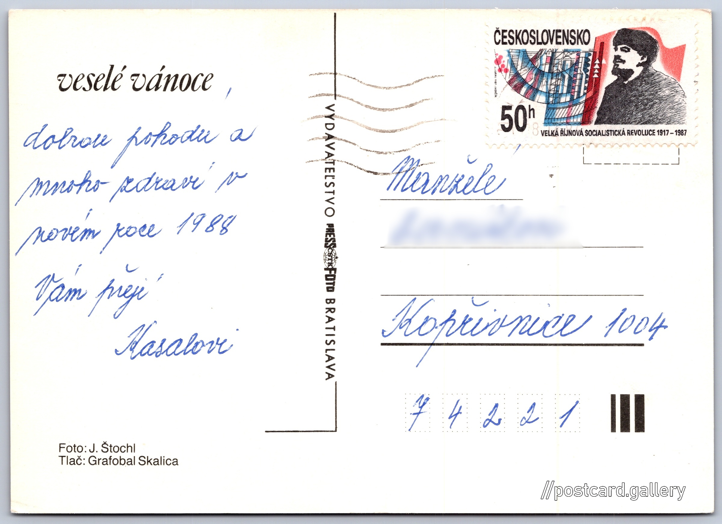 Vánoční přání Pokud chcete vidět pohlednice ve vyšším rozlišení nebo zobrazovat jejich zadní stranu, tak se prosím nejdříve přihlašte Přihlásit Zaregistrovat Ukázat zadní stranu pohlednice veselé vánoce Jazyk tištěného textu na pohlednici: čeština Vydavatel: PressFoto Bratislava (Československo) Odhadované datum vydání pohlednice: 1984 - 1987 Pomozte nám zpřesnit rok vzniku pohlednice Velikost (š x v) a tvar pohlednice: 147 x 105 mm (5.79" x 4.13"), obdélník Osoby spjaté s touto pohlednicí: Josef Štochl(Autor fotografie) Prošlá poštou:Datum na razítku: 18.12.1987 Ceny: Vyplacené známky: 0,50 Kčs (CSK) DiskuseVložit příspěvek Přidat novou složku ... Spravovat složky ...