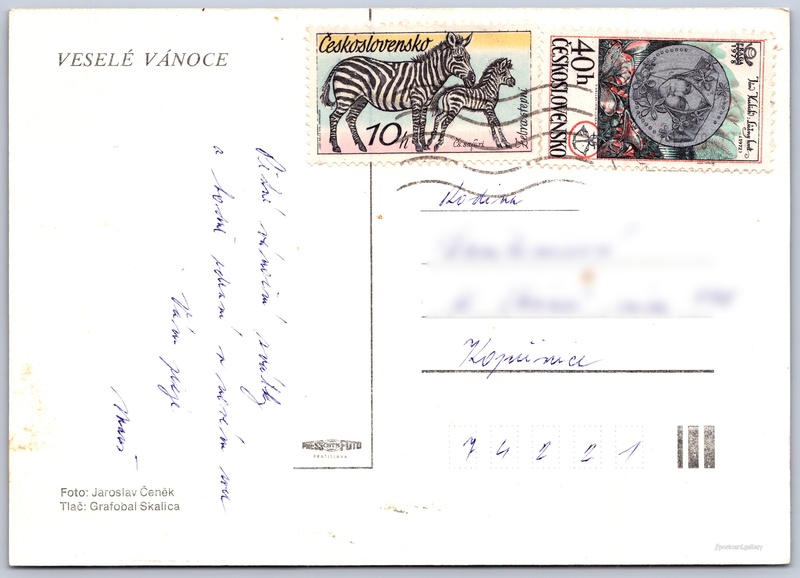 Vánoční přání Pokud chcete vidět pohlednice ve vyšším rozlišení nebo zobrazovat jejich zadní stranu, tak se prosím nejdříve přihlašte Přihlásit Zaregistrovat VESELÉ VÁNOCE Jazyk tištěného textu na pohlednici: čeština Vydavatel: PressFoto Bratislava (Československo) Odhadované datum vydání pohlednice: 1976 - 1979 Pomozte nám zpřesnit rok vzniku pohlednice Velikost (š x v) a tvar pohlednice: 147 x 105 mm (5.79" x 4.13"), obdélník Osoby spjaté s touto pohlednicí: Jaroslav Čeněk(Autor fotografie) Prošlá poštou:Datum na razítku: 22.12.1979 Ceny: Vyplacené známky: 0,50 Kčs (CSK) DiskuseVložit příspěvek Přidat novou složku ... Spravovat složky ...
