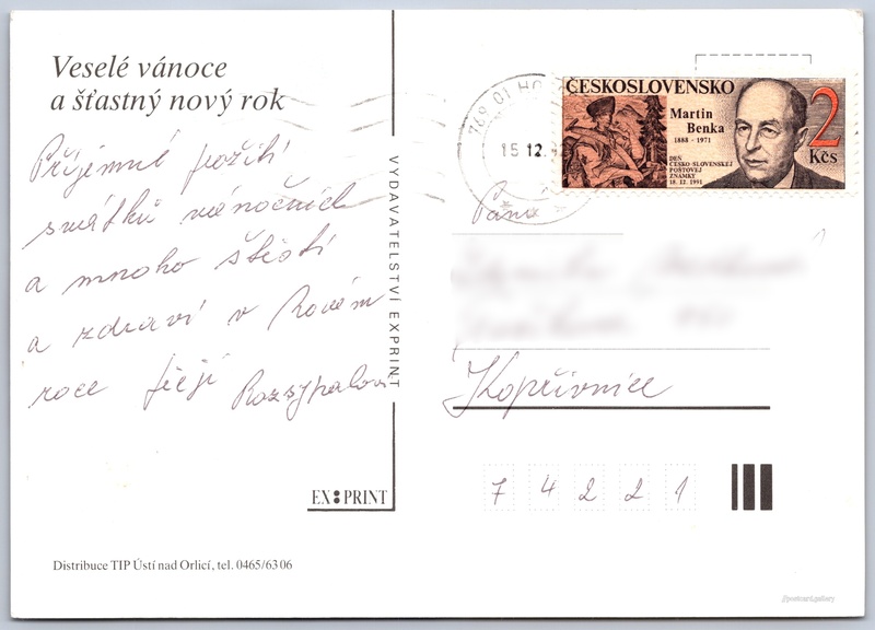 Vánoční přání Pokud chcete vidět pohlednice ve vyšším rozlišení nebo zobrazovat jejich zadní stranu, tak se prosím nejdříve přihlašte Přihlásit Zaregistrovat Veselé vánoce a šťastný nový rok Jazyk tištěného textu na pohlednici: čeština Vydavatel: Vydavatelství Exprint (Česko) Odhadované datum vydání pohlednice: 1989 - 1992 Pomozte nám zpřesnit rok vzniku pohlednice Velikost (š x v) a tvar pohlednice: 147 x 105 mm (5.79" x 4.13"), obdélník Prošlá poštou:Datum na razítku: 15.12.1992 Ceny: Vyplacené známky: 2,00 Kčs (CSK) DiskuseVložit příspěvek Přidat novou složku ... Spravovat složky ...