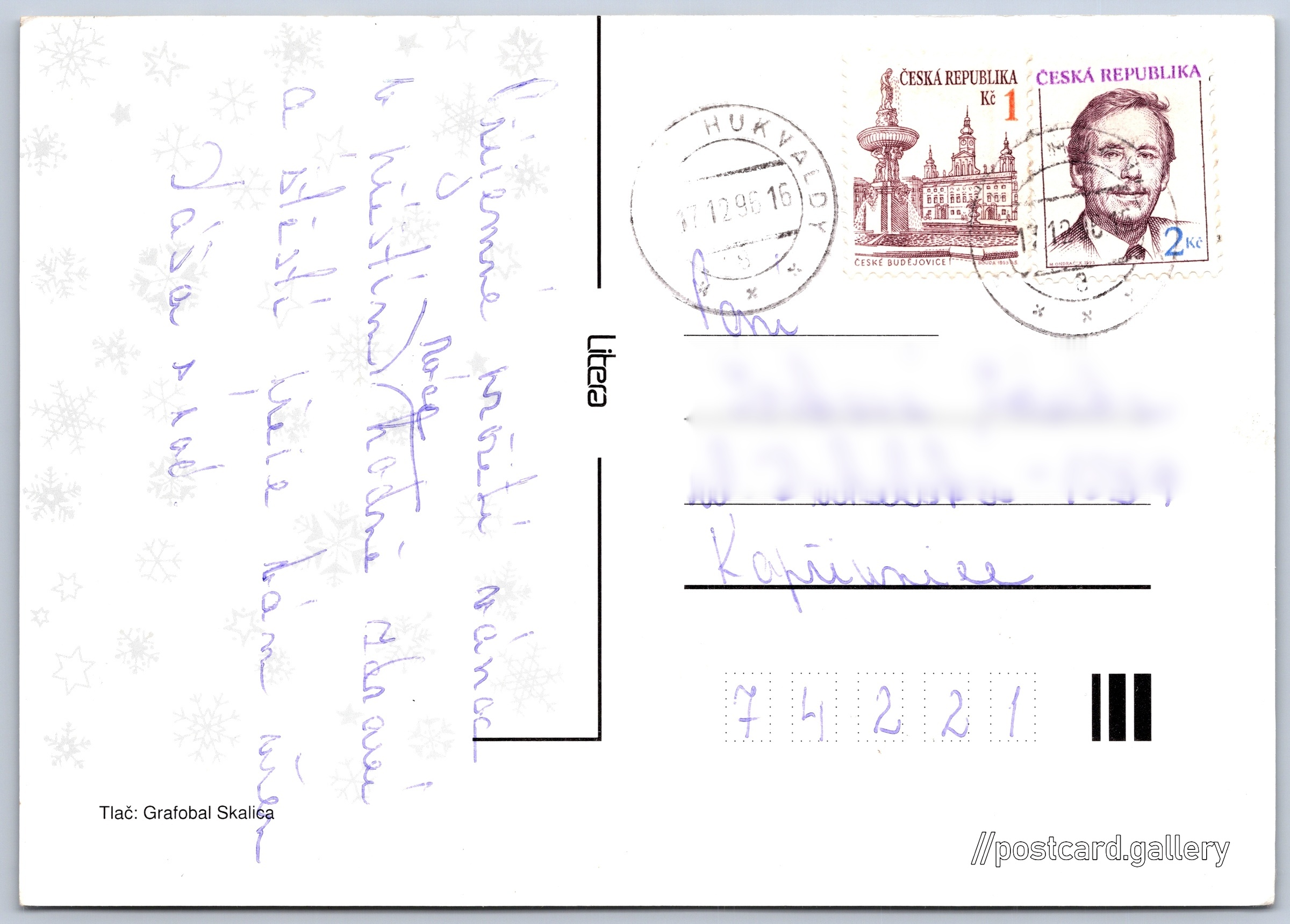 Vánoční přání Pokud chcete vidět pohlednice ve vyšším rozlišení nebo zobrazovat jejich zadní stranu, tak se prosím nejdříve přihlašte Přihlásit Zaregistrovat Jazyk tištěného textu na pohlednici: slovenština Vydavatel: Litera (Česko) Odhadované datum vydání pohlednice: 1993 - 1996 Pomozte nám zpřesnit rok vzniku pohlednice Velikost (š x v) a tvar pohlednice: 147 x 105 mm (5.79" x 4.13"), obdélník Prošlá poštou:Datum na razítku: 17.12.1996 Ceny: Vyplacené známky: 3,00 Kč (CZK) DiskuseVložit příspěvek Přidat novou složku ... Spravovat složky ...