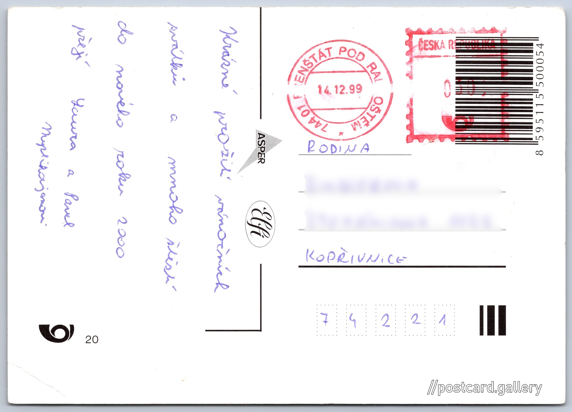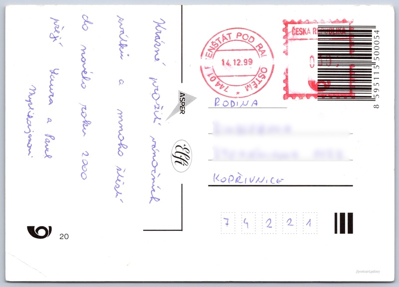 Vánoční přání Pokud chcete vidět pohlednice ve vyšším rozlišení nebo zobrazovat jejich zadní stranu, tak se prosím nejdříve přihlašte Přihlásit Zaregistrovat Veselé Vánoce Jazyk tištěného textu na pohlednici: čeština Vydavatel: Asper Elfi (Česko) Odhadované datum vydání pohlednice: 1996 - 1999 Pomozte nám zpřesnit rok vzniku pohlednice Velikost (š x v) a tvar pohlednice: 147 x 105 mm (5.79" x 4.13"), obdélník Prošlá poštou:Datum na razítku: 14.12.1999 Ceny: Vyplacené známky: 3,00 Kč (CZK) Kódy na pohlednici: 8595115500054 ČP 20 DiskuseVložit příspěvek Přidat novou složku ... Spravovat složky ...