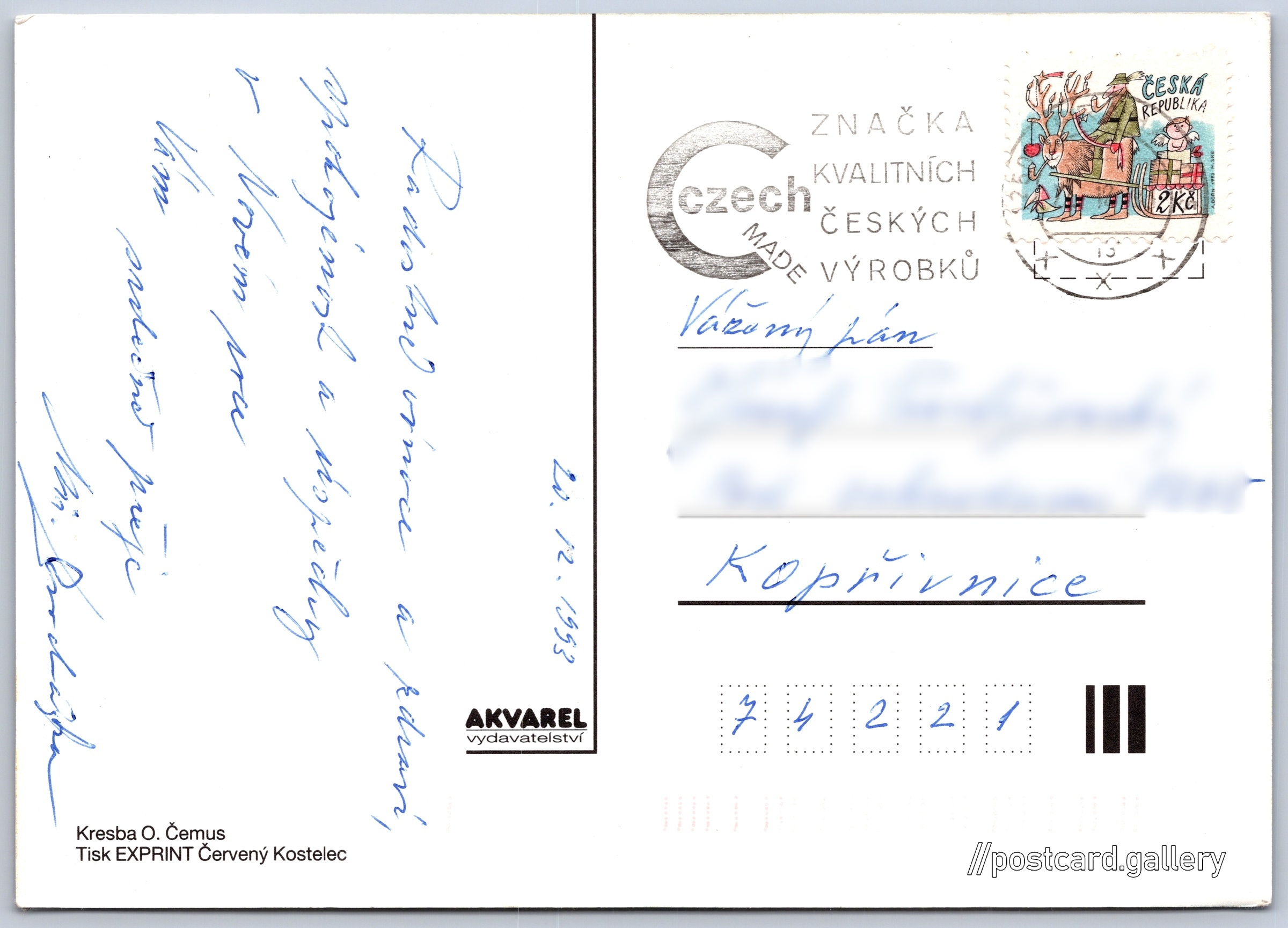 Vánoční přání Pokud chcete vidět pohlednice ve vyšším rozlišení nebo zobrazovat jejich zadní stranu, tak se prosím nejdříve přihlašte Přihlásit Zaregistrovat Jazyk tištěného textu na pohlednici: čeština Vydavatel: Akvarel (Česko) Odhadované datum vydání pohlednice: 1990 - 1993 Pomozte nám zpřesnit rok vzniku pohlednice Velikost (š x v) a tvar pohlednice: 148 x 105 mm (5.83" x 4.13"), obdélník Osoby spjaté s touto pohlednicí: O. Čemus(Autor předlohy) Prošlá poštou:Datum napsání pohledu: 20.12.1993 Ceny: Vyplacené známky: 2,00 Kč (CZK) DiskuseVložit příspěvek Přidat novou složku ... Spravovat složky ...