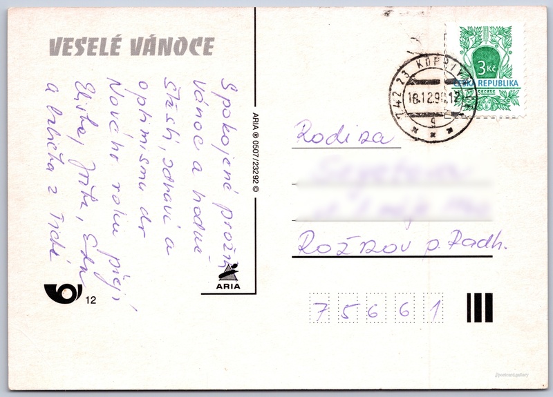 Vánoční přání Pokud chcete vidět pohlednice ve vyšším rozlišení nebo zobrazovat jejich zadní stranu, tak se prosím nejdříve přihlašte Přihlásit Zaregistrovat VESELÉ VÁNOCE VESELÉ VÁNOCE Jazyk tištěného textu na pohlednici: čeština Vydavatel: ARIA-Cards (Česko) Odhadované datum vydání pohlednice: 1993 - 1996 Pomozte nám zpřesnit rok vzniku pohlednice Velikost (š x v) a tvar pohlednice: 147 x 105 mm (5.79" x 4.13"), obdélník Prošlá poštou Ceny: Vyplacené známky: 3,00 Kč (CZK) Kódy na pohlednici: ČP 12 DiskuseVložit příspěvek Přidat novou složku ... Spravovat složky ...