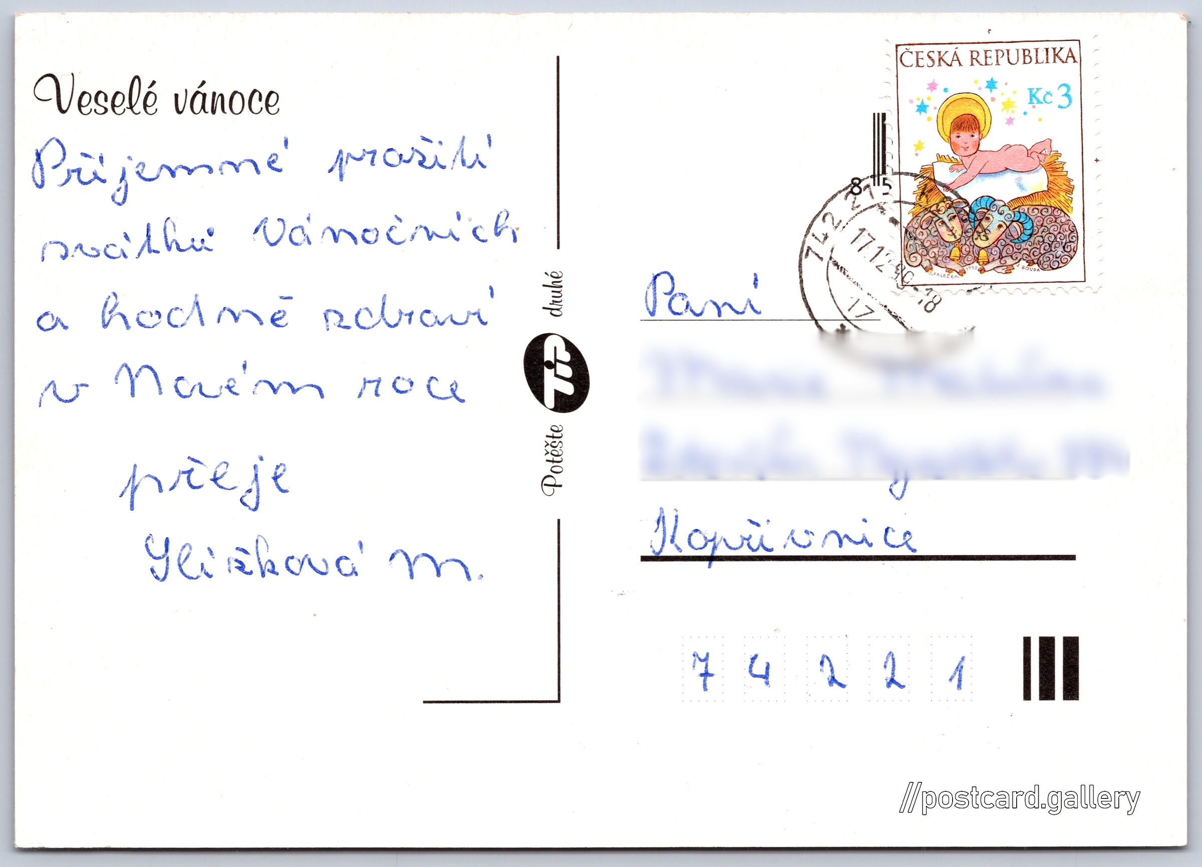 Vánoční přání Pokud chcete vidět pohlednice ve vyšším rozlišení nebo zobrazovat jejich zadní stranu, tak se prosím nejdříve přihlašte Přihlásit Zaregistrovat Veselé vánoce Jazyk tištěného textu na pohlednici: čeština Vydavatel: TIP Ústí nad Orlicí (Česko) Odhadované datum vydání pohlednice: 1996 - 1999 Pomozte nám zpřesnit rok vzniku pohlednice Velikost (š x v) a tvar pohlednice: 147 x 105 mm (5.79" x 4.13"), obdélník Prošlá poštou:Datum na razítku: 17.12.1999 Ceny: Vyplacené známky: 3,00 Kč (CZK) DiskuseVložit příspěvek Přidat novou složku ... Spravovat složky ...