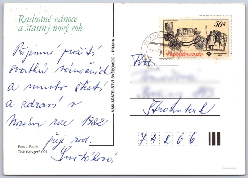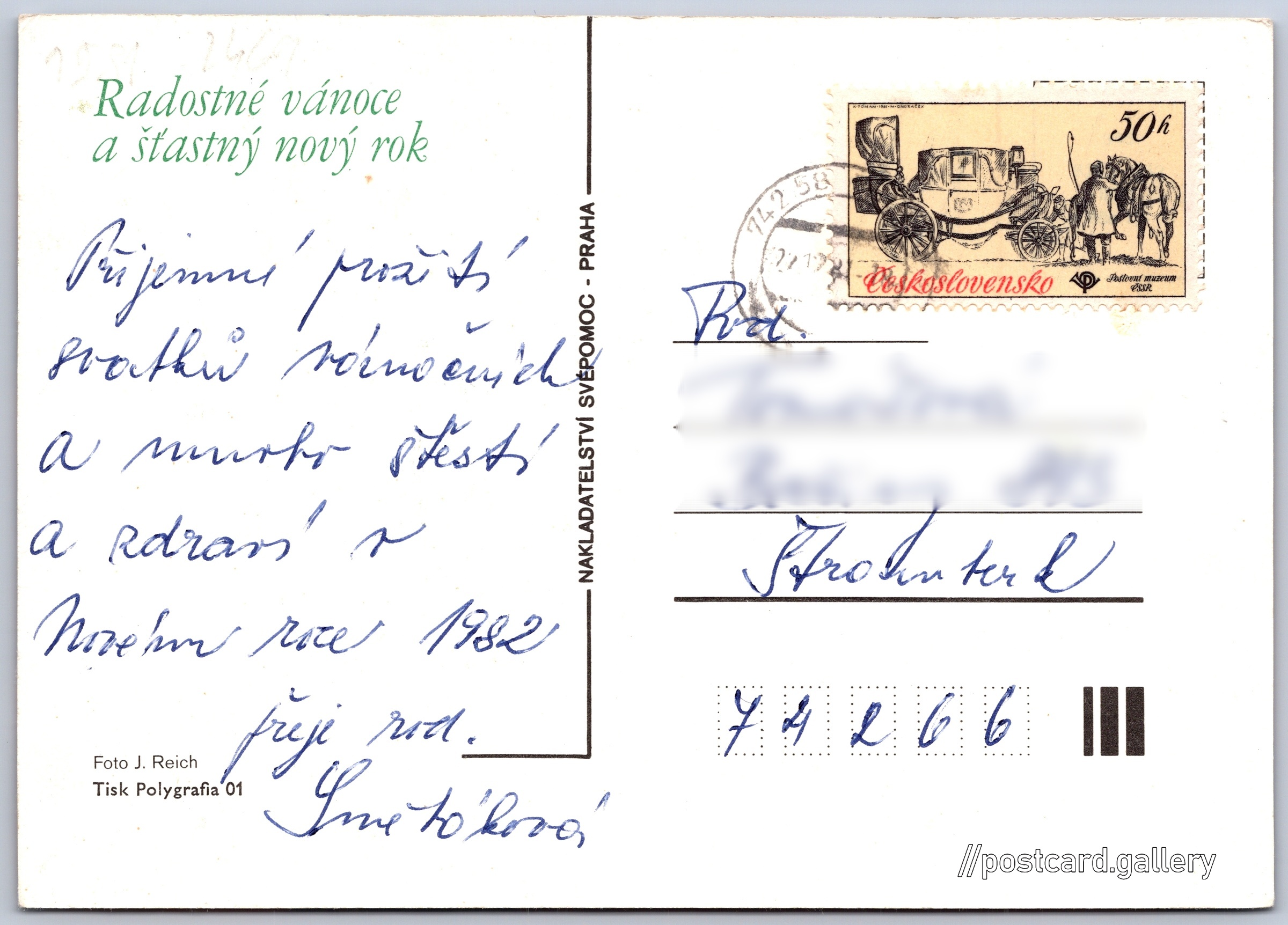 Vánoční přání Pokud chcete vidět pohlednice ve vyšším rozlišení nebo zobrazovat jejich zadní stranu, tak se prosím nejdříve přihlašte Přihlásit Zaregistrovat Radostné vánoce a šťastný nový rok Jazyk tištěného textu na pohlednici: čeština Vydavatel: Nakladatelství Svépomoc, Praha (Československo) Datum vydání není známo Pomozte nám odhadnout datum vzniku pohlednice Velikost (š x v) a tvar pohlednice: 148 x 105 mm (5.83" x 4.13"), obdélník Osoby spjaté s touto pohlednicí: Jan Reich(Autor fotografie) Prošlá poštou Ceny: Vyplacené známky: 0,50 Kčs (CSK) DiskuseVložit příspěvek Přidat novou složku ... Spravovat složky ...
