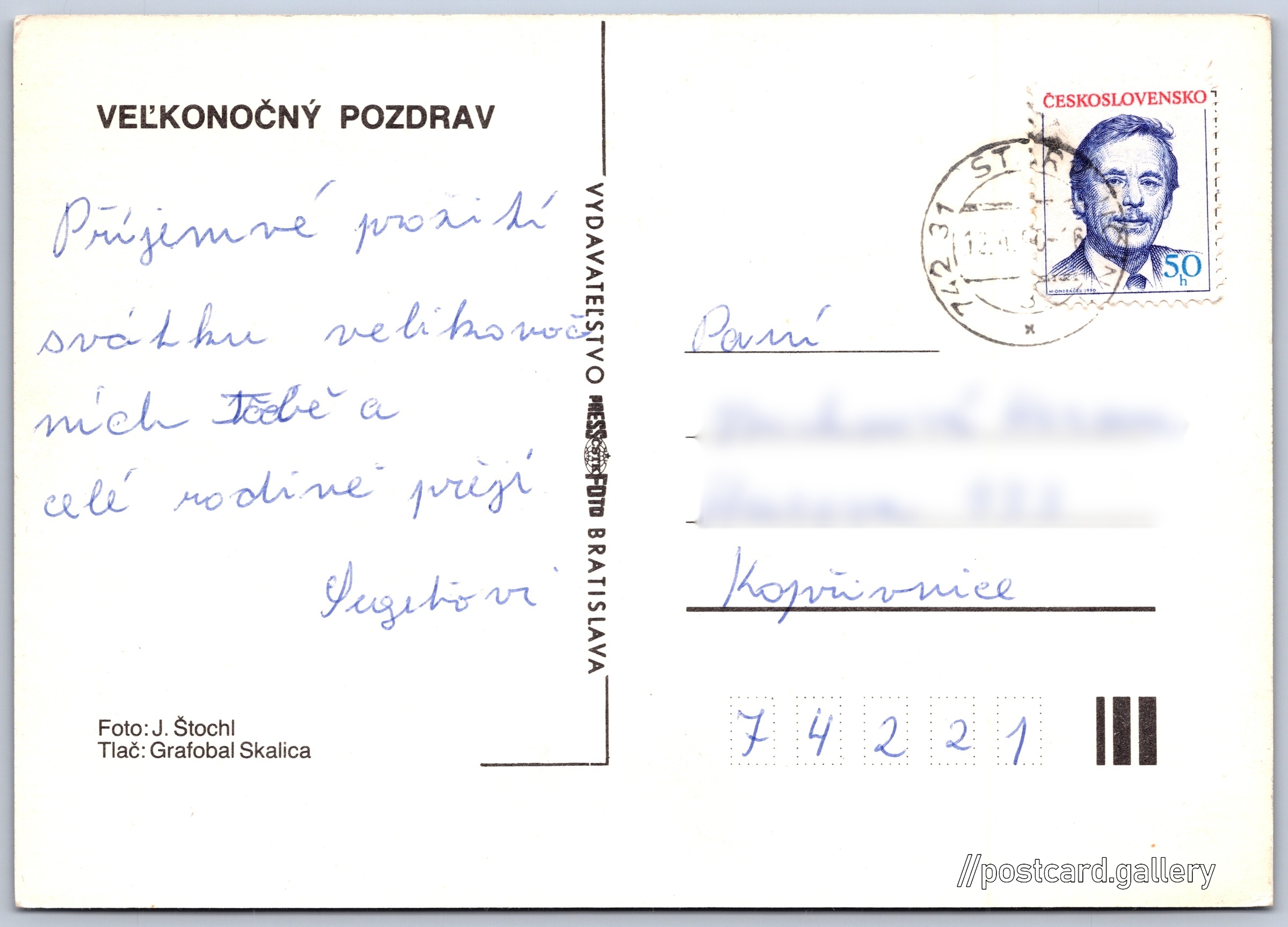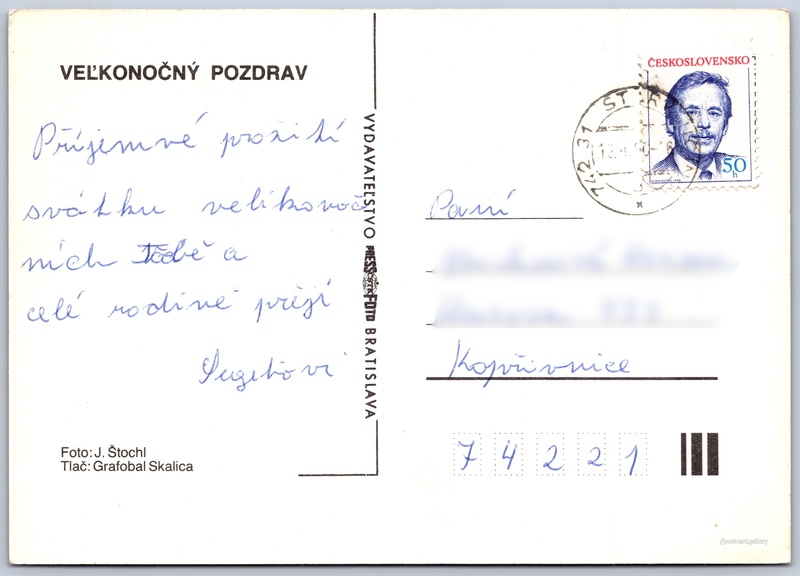 Velikonoční pozdrav Pokud chcete vidět pohlednice ve vyšším rozlišení nebo zobrazovat jejich zadní stranu, tak se prosím nejdříve přihlašte Přihlásit Zaregistrovat VEĽKONOČNÝ POZDRAV Jazyk tištěného textu na pohlednici: slovenština Vydavatel: PressFoto Bratislava (Československo) Odhadované datum vydání pohlednice: 1987 - 1990 Pomozte nám zpřesnit rok vzniku pohlednice Velikost (š x v) a tvar pohlednice: 148 x 104 mm (5.83" x 4.09"), obdélník Osoby spjaté s touto pohlednicí: Josef Štochl(Autor fotografie) Prošlá poštou:Datum na razítku: 13.4.1990 Ceny: Vyplacené známky: 0,50 Kčs (CSK) DiskuseVložit příspěvek Přidat novou složku ... Spravovat složky ...
