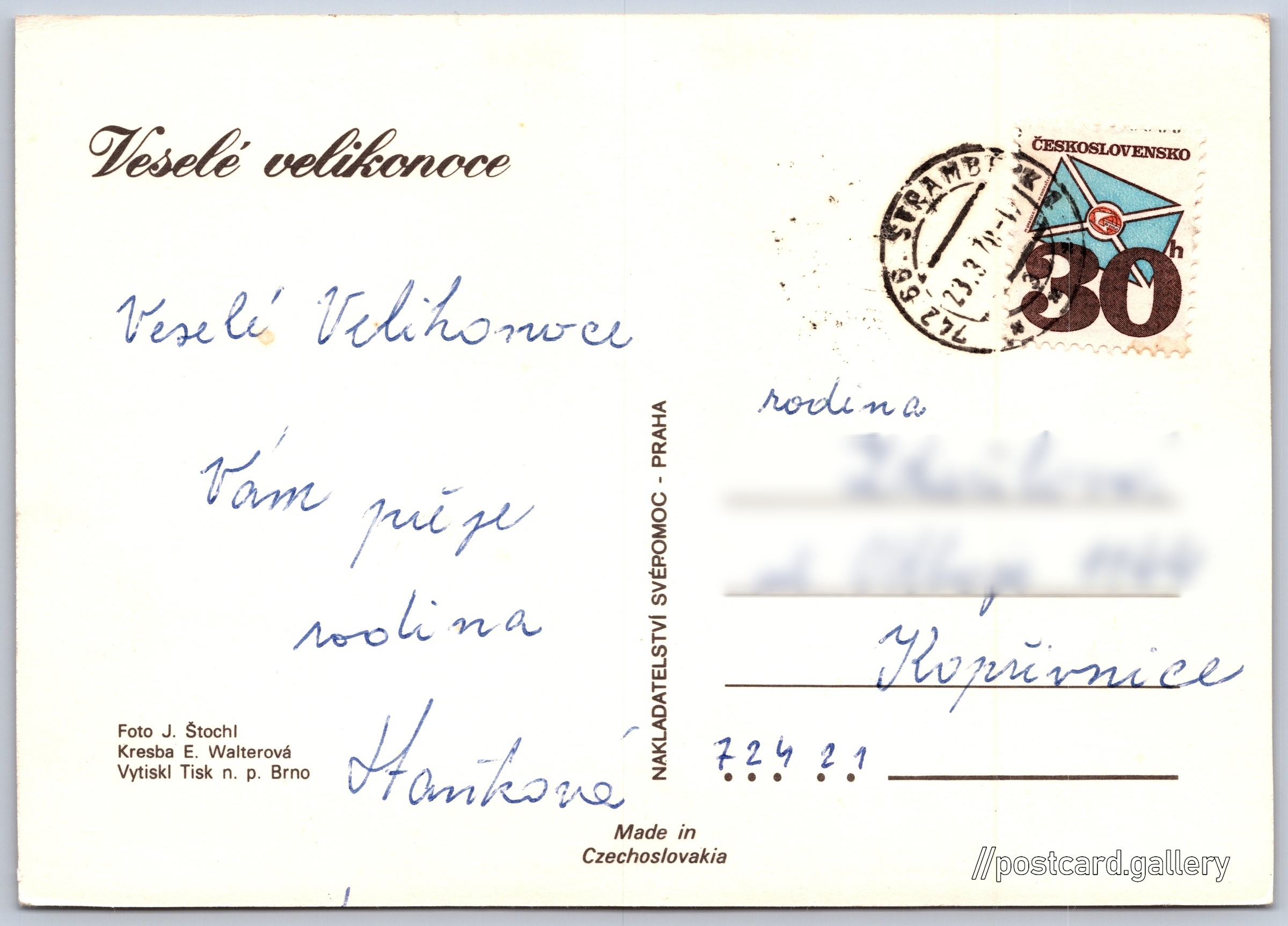 Velikonoční přání, kraslice Pokud chcete vidět pohlednice ve vyšším rozlišení nebo zobrazovat jejich zadní stranu, tak se prosím nejdříve přihlašte Přihlásit Zaregistrovat Veselé velikonoceMade in Czechoslovakia Jazyk tištěného textu na pohlednici: čeština Vydavatel: Nakladatelství Svépomoc, Praha (Československo) Odhadované datum vydání pohlednice: 1975 - 1978 Pomozte nám zpřesnit rok vzniku pohlednice Velikost (š x v) a tvar pohlednice: 148 x 105 mm (5.83" x 4.13"), obdélník Osoby spjaté s touto pohlednicí: Josef Štochl(Autor fotografie) E. Walterová(Design pohlednice) Prošlá poštou:Datum na razítku: 23.3.1978 Ceny: Vyplacené známky: 0,30 Kčs (CSK) DiskuseVložit příspěvek Přidat novou složku ... Spravovat složky ...