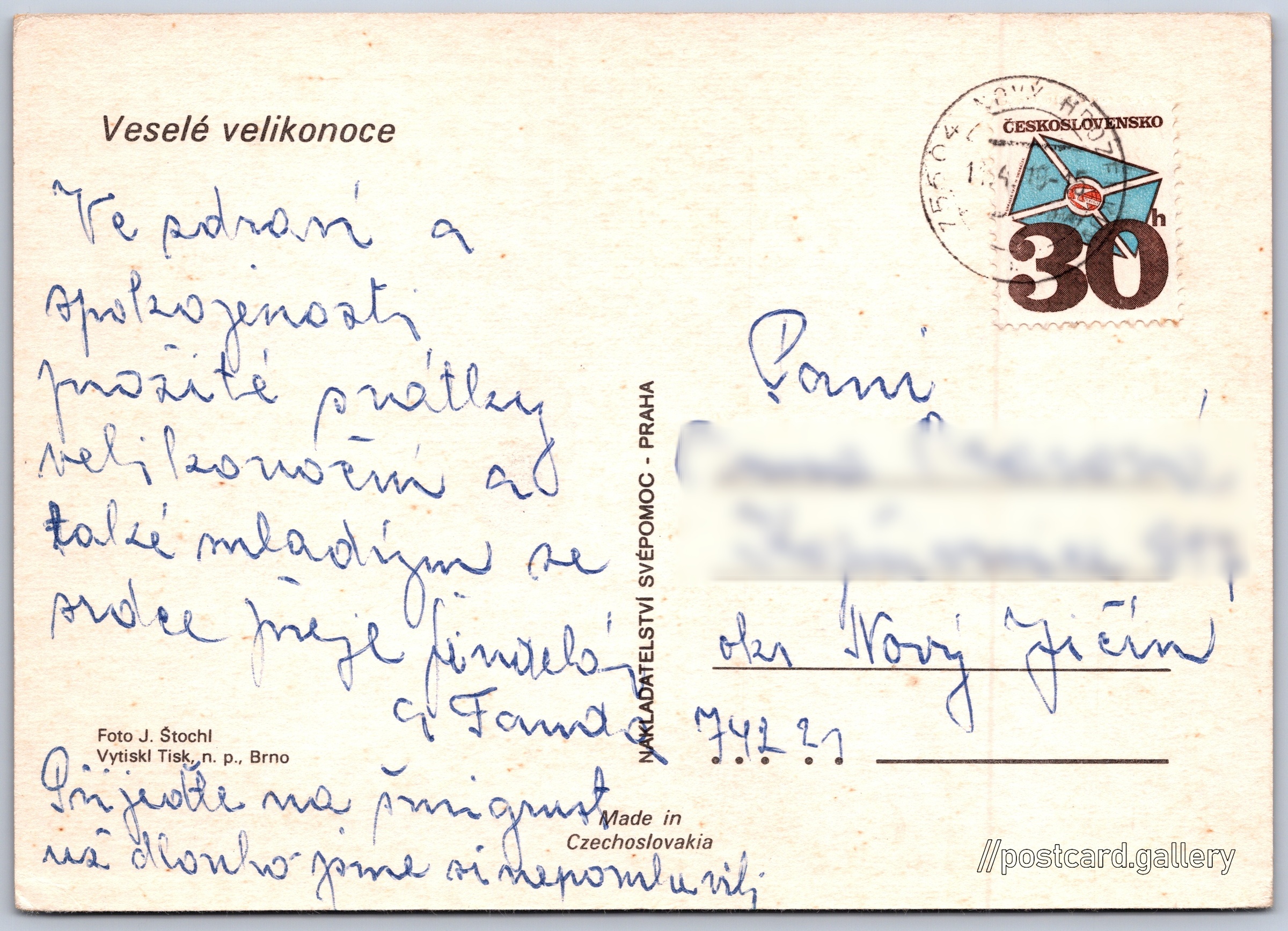 Velikonoční přání, ošatka s kraslicemi Pokud chcete vidět pohlednice ve vyšším rozlišení nebo zobrazovat jejich zadní stranu, tak se prosím nejdříve přihlašte Přihlásit Zaregistrovat Veselé velikonoceMade in Czechoslovakia Jazyk tištěného textu na pohlednici: čeština Vydavatel: Nakladatelství Svépomoc, Praha (Československo) Odhadované datum vydání pohlednice: 1976 - 1979 Pomozte nám zpřesnit rok vzniku pohlednice Velikost (š x v) a tvar pohlednice: 147 x 104 mm (5.79" x 4.09"), obdélník Osoby spjaté s touto pohlednicí: Josef Štochl(Autor fotografie) Prošlá poštou:Datum na razítku: 11.4.1979 Ceny: Vyplacené známky: 0,30 Kčs (CSK) DiskuseVložit příspěvek Přidat novou složku ... Spravovat složky ...
