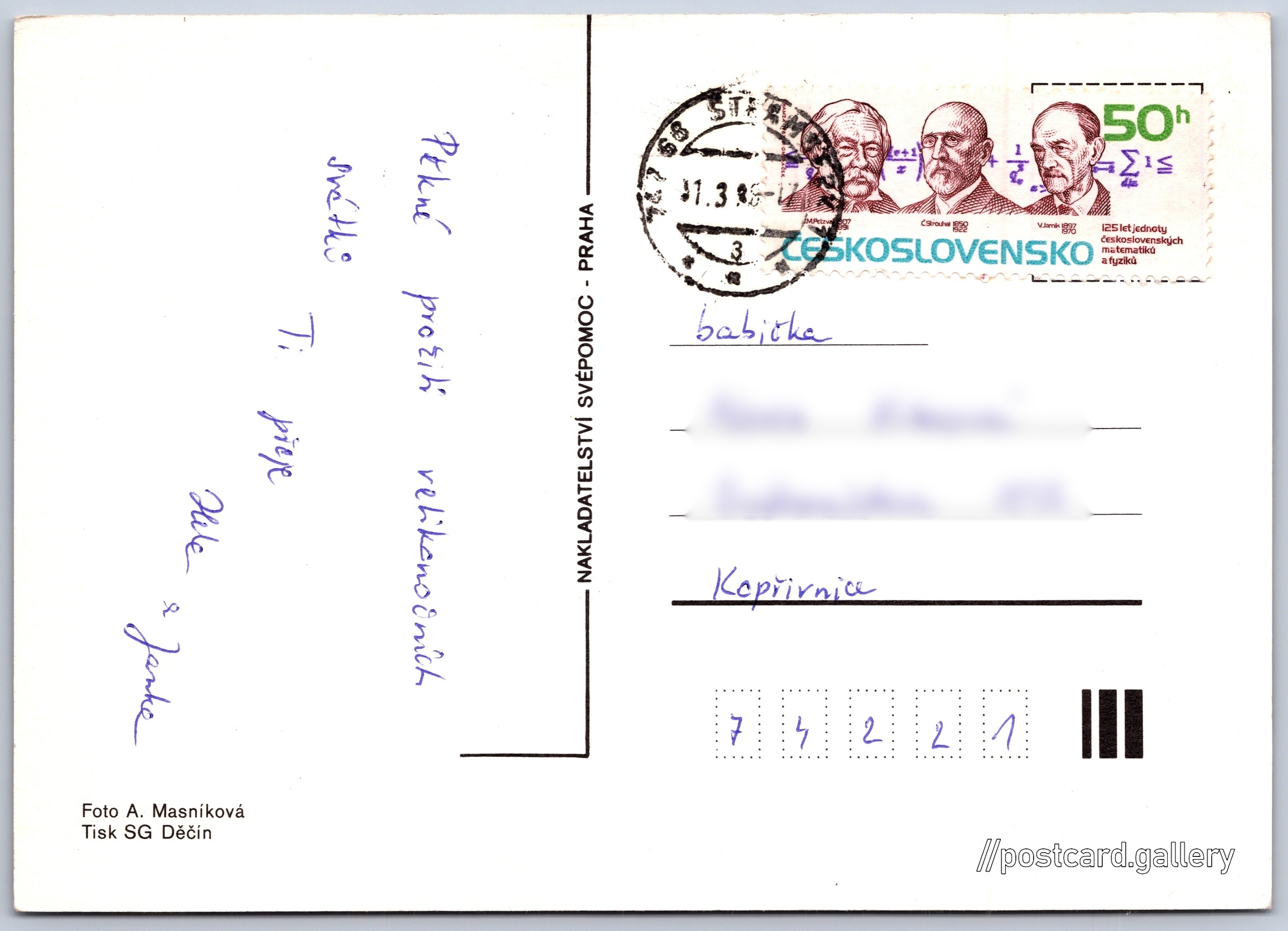 Velikonoční přání Pokud chcete vidět pohlednice ve vyšším rozlišení nebo zobrazovat jejich zadní stranu, tak se prosím nejdříve přihlašte Přihlásit Zaregistrovat Jazyk tištěného textu na pohlednici: čeština Vydavatel: Nakladatelství Svépomoc, Praha (Československo) Odhadované datum vydání pohlednice: 1985 - 1988 Pomozte nám zpřesnit rok vzniku pohlednice Velikost (š x v) a tvar pohlednice: 148 x 105 mm (5.83" x 4.13"), obdélník Osoby spjaté s touto pohlednicí: A. Masníková(Autor fotografie) Prošlá poštou:Datum na razítku: 31.3.1988 Ceny: Vyplacené známky: 0,50 Kčs (CSK) DiskuseVložit příspěvek Přidat novou složku ... Spravovat složky ...