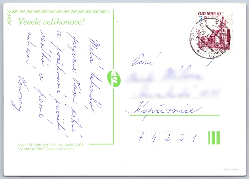 Velikonoční přání Pokud chcete vidět pohlednice ve vyšším rozlišení nebo zobrazovat jejich zadní stranu, tak se prosím nejdříve přihlašte Přihlásit Zaregistrovat Veselé velikonoce Veselé velikonoce! Jazyk tištěného textu na pohlednici: čeština Vydavatel: TIP Ústí nad Orlicí (Česko) Odhadované datum vydání pohlednice: 1991 - 1994 Pomozte nám zpřesnit rok vzniku pohlednice Velikost (š x v) a tvar pohlednice: 147 x 105 mm (5.79" x 4.13"), obdélník Prošlá poštou:Datum na razítku: 29.3.1994 Ceny: Vyplacené známky: 2,00 Kč (CZK) DiskuseVložit příspěvek Přidat novou složku ... Spravovat složky ...