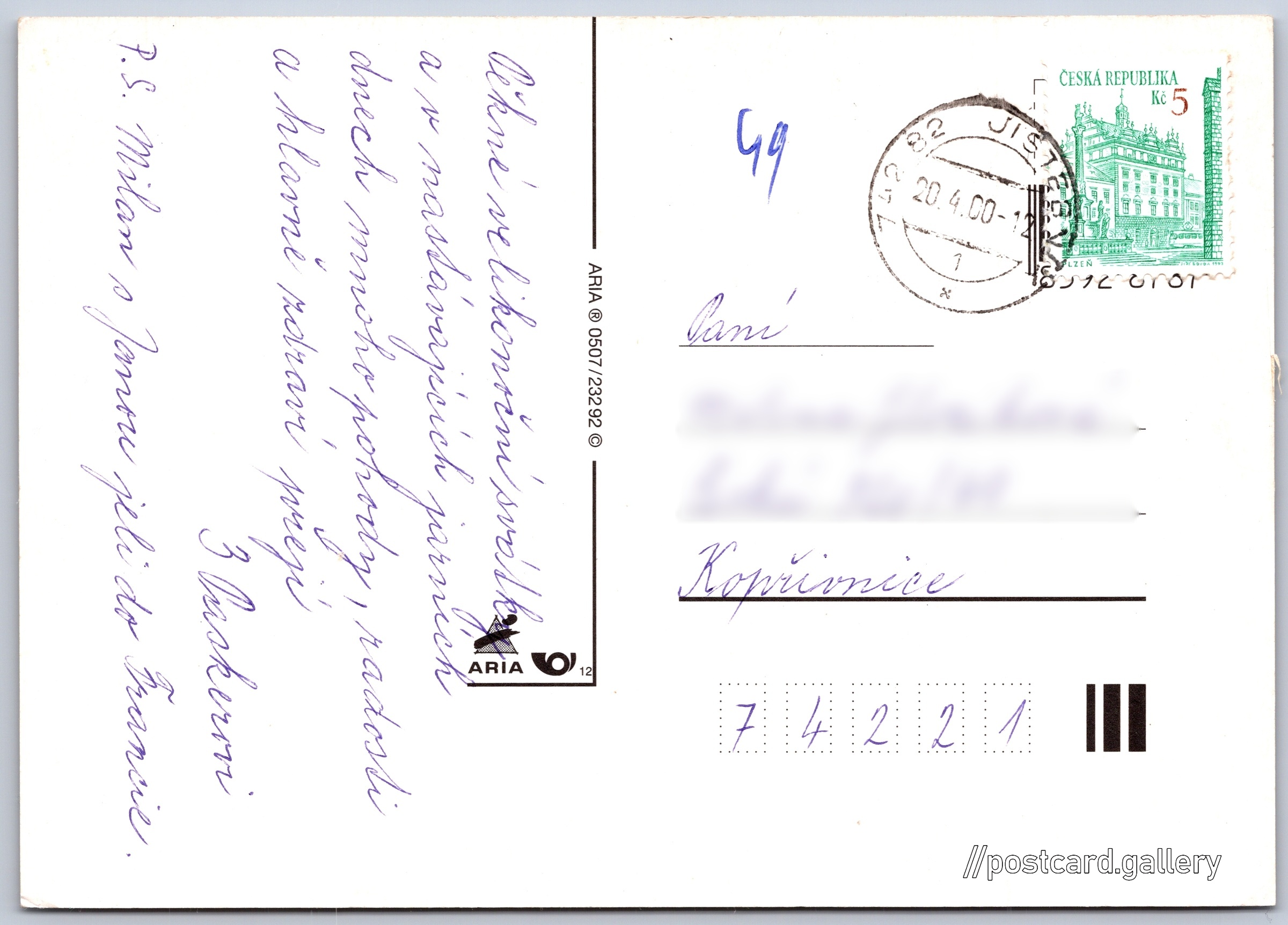 Velikonoční přání Pokud chcete vidět pohlednice ve vyšším rozlišení nebo zobrazovat jejich zadní stranu, tak se prosím nejdříve přihlašte Přihlásit Zaregistrovat Veselé Velikonoce Jazyk tištěného textu na pohlednici: čeština Vydavatel: ARIA-Cards (Česko) Odhadované datum vydání pohlednice: 1997 - 2000 Pomozte nám zpřesnit rok vzniku pohlednice Velikost (š x v) a tvar pohlednice: 147 x 105 mm (5.79" x 4.13"), obdélník Prošlá poštou:Datum na razítku: 20.4.2000 Ceny: Vyplacené známky: 5,00 Kč (CZK) Kódy na pohlednici: ČP 12 DiskuseVložit příspěvek Přidat novou složku ... Spravovat složky ...