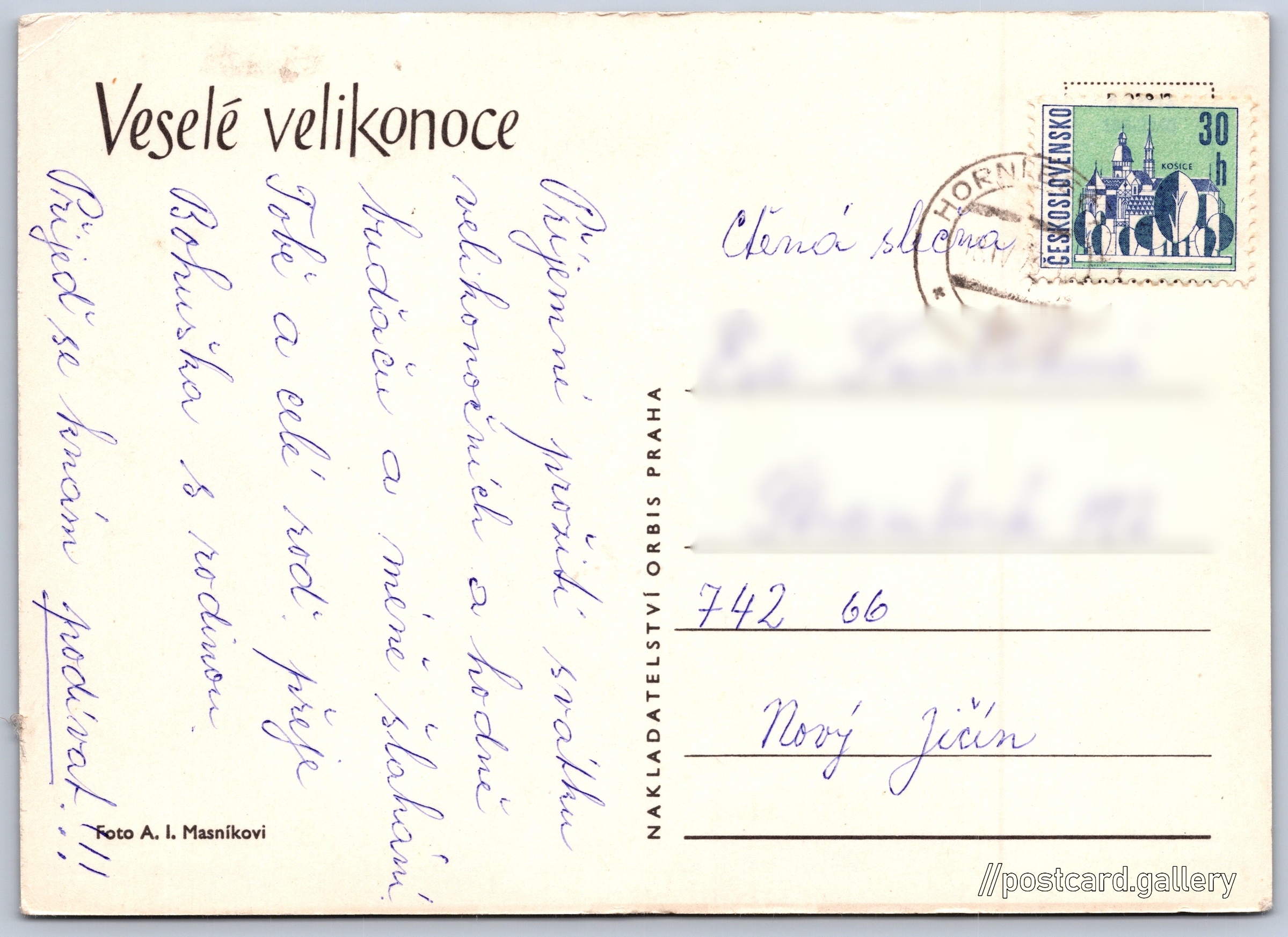 Velikonoční přání Pokud chcete vidět pohlednice ve vyšším rozlišení nebo zobrazovat jejich zadní stranu, tak se prosím nejdříve přihlašte Přihlásit Zaregistrovat Veselé velikonoce Jazyk tištěného textu na pohlednici: čeština Vydavatel: Nakladatelství Orbis (Československo) Odhadované datum vydání pohlednice: 1970 - 1973 Pomozte nám zpřesnit rok vzniku pohlednice Velikost (š x v) a tvar pohlednice: 148 x 106 mm (5.83" x 4.17"), obdélník Prošlá poštou:Datum na razítku: 18.4.1973 Ceny: Vyplacené známky: 0,30 Kčs (CSK) DiskuseVložit příspěvek Přidat novou složku ... Spravovat složky ...