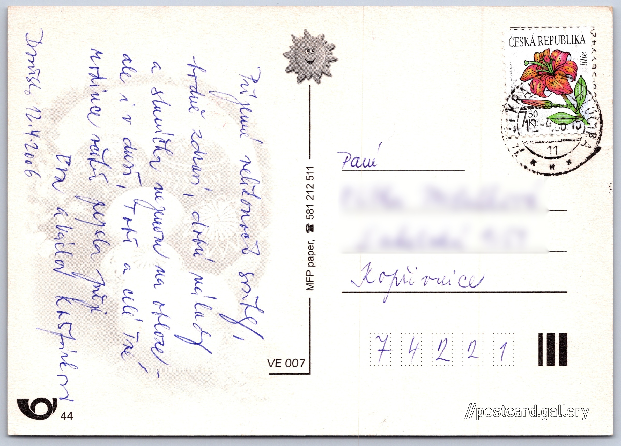 Velikonoční přání Pokud chcete vidět pohlednice ve vyšším rozlišení nebo zobrazovat jejich zadní stranu, tak se prosím nejdříve přihlašte Přihlásit Zaregistrovat Veselé velikonoce Jazyk tištěného textu na pohlednici: čeština Vydavatel: MFP paper (Česko) Odhadované datum vydání pohlednice: 2003 - 2006 Pomozte nám zpřesnit rok vzniku pohlednice Velikost (š x v) a tvar pohlednice: 147 x 105 mm (5.79" x 4.13"), obdélník Prošlá poštou:Datum na razítku: 12.4.2006 Ceny: Vyplacené známky: 7,50 Kč (CZK) Kódy na pohlednici: VE 007 ČP 44 DiskuseVložit příspěvek Přidat novou složku ... Spravovat složky ...