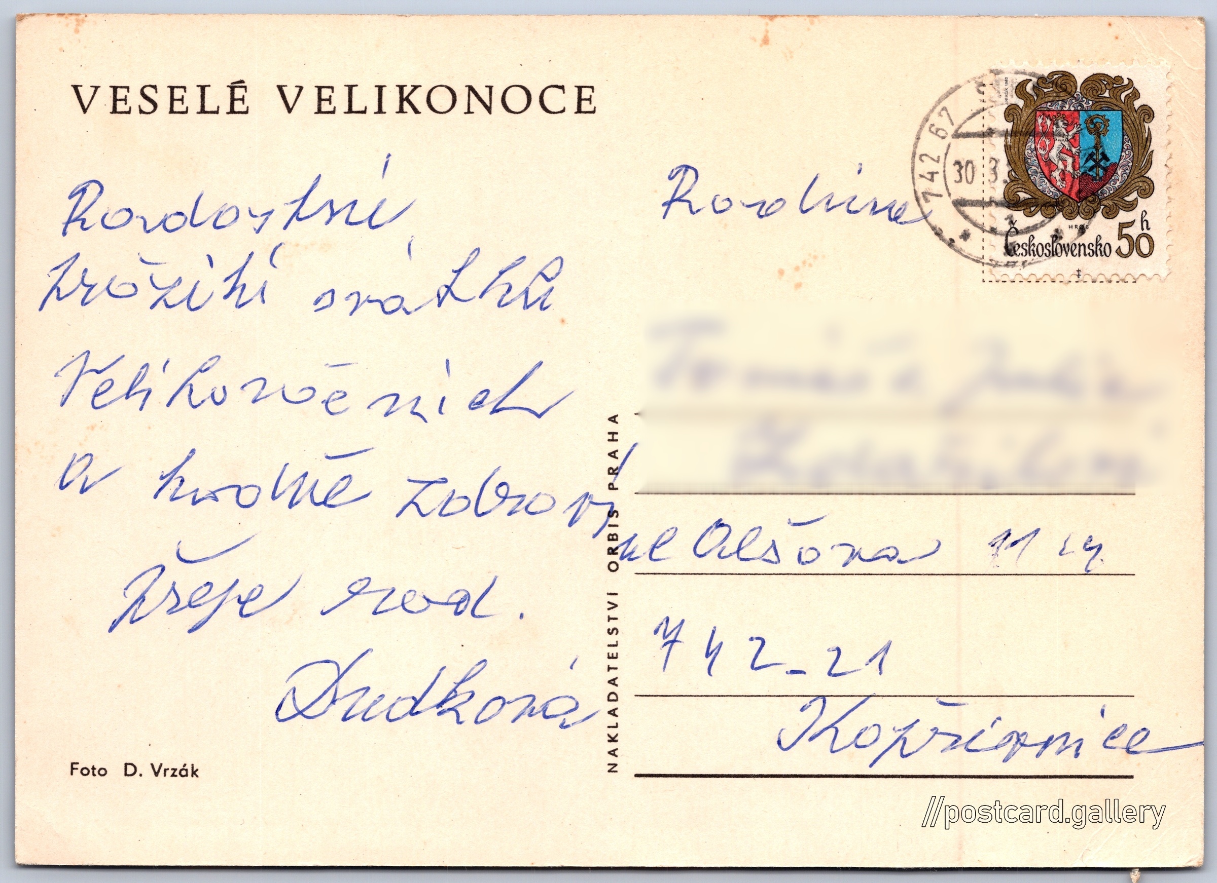 Velikonoční přání Pokud chcete vidět pohlednice ve vyšším rozlišení nebo zobrazovat jejich zadní stranu, tak se prosím nejdříve přihlašte Přihlásit Zaregistrovat VESELÉ VELIKONOCE Jazyk tištěného textu na pohlednici: čeština Vydavatel: Nakladatelství Orbis (Československo) Odhadované datum vydání pohlednice: 1980 - 1983 Pomozte nám zpřesnit rok vzniku pohlednice Velikost (š x v) a tvar pohlednice: 146 x 106 mm (5.75" x 4.17"), obdélník Osoby spjaté s touto pohlednicí: Daniel Vrzák(Autor fotografie) Prošlá poštou:Datum na razítku: 30.3.1983 Ceny: Vyplacené známky: 0,50 Kčs (CSK) DiskuseVložit příspěvek Přidat novou složku ... Spravovat složky ...