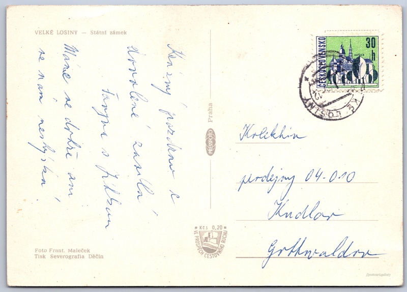 Velké Losiny, zámek Pokud chcete vidět pohlednice ve vyšším rozlišení nebo zobrazovat jejich zadní stranu, tak se prosím nejdříve přihlašte Přihlásit Zaregistrovat VELKÉ LOSINY - Státní zámek Jazyk tištěného textu na pohlednici: čeština Velké Losiny, Šumperk ukázat na mapě V blízkém okolí místa zobrazeného na pohlednici lze najít 5 jiných pohlednic. Zobrazit blízké pohlednice Vydavatel: PressFoto Praha (Československo) Datum vydání není známo Pomozte nám odhadnout datum vzniku pohlednice Velikost (š x v) a tvar pohlednice: 147 x 104 mm (5.79" x 4.09"), obdélník Osoby spjaté s touto pohlednicí: František Maleček(Autor fotografie) Prošlá poštou Ceny: Příplatek na tur. ruch: 0,20 Kčs (CSK))Vyplacené známky: 0,30 Kčs (CSK) DiskuseVložit příspěvek Přidat novou složku ... Spravovat složky ...