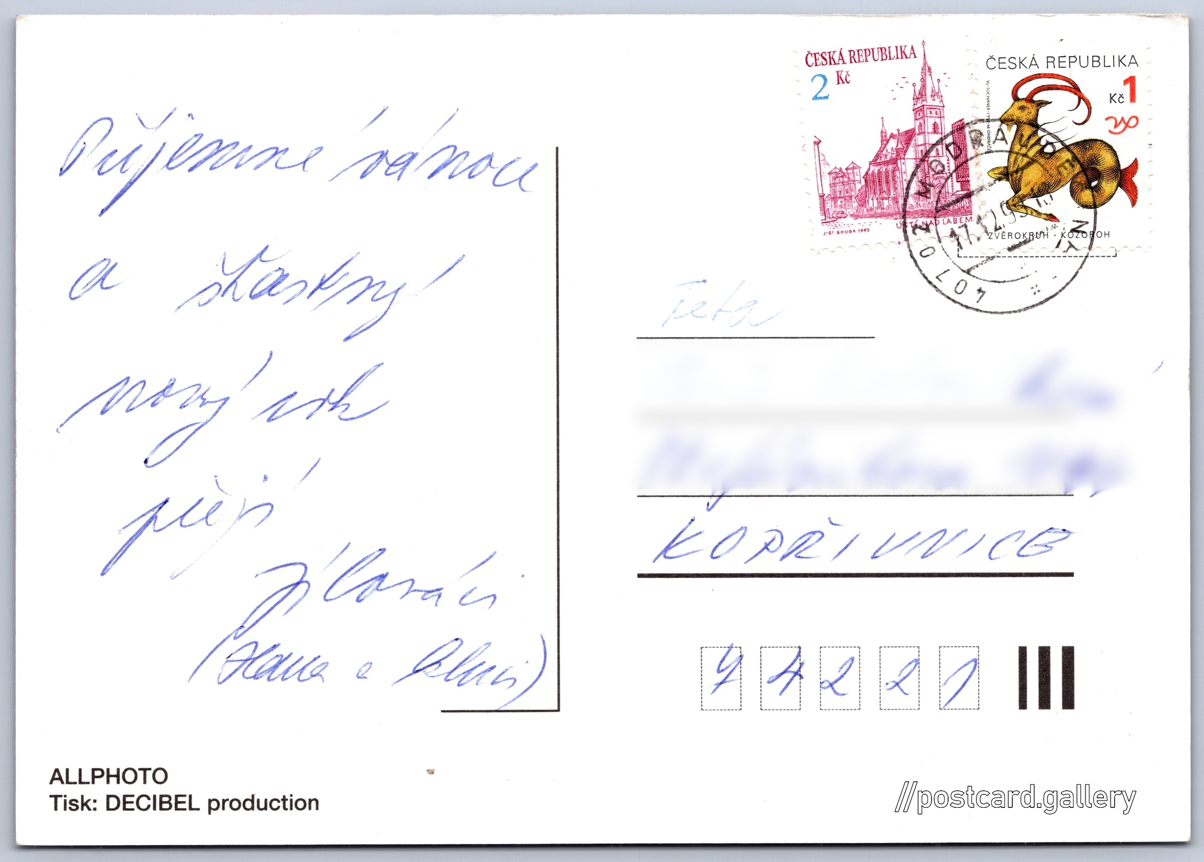 Veselé Vánoce a šťastný Nový rok Pokud chcete vidět pohlednice ve vyšším rozlišení nebo zobrazovat jejich zadní stranu, tak se prosím nejdříve přihlašte Přihlásit Zaregistrovat Veselé Vánoce a šťastný Nový rok Jazyk tištěného textu na pohlednici: čeština Vydavatel: allphoto (Česko) Odhadované datum vydání pohlednice: 1996 - 1999 Pomozte nám zpřesnit rok vzniku pohlednice Velikost (š x v) a tvar pohlednice: 148 x 104 mm (5.83" x 4.09"), obdélník Prošlá poštou:Datum na razítku: 17.12.1999 Ceny: Vyplacené známky: 3,00 Kč (CZK) DiskuseVložit příspěvek Přidat novou složku ... Spravovat složky ...