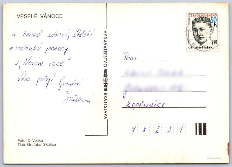 Veselé vánoce, svíčky Pokud chcete vidět pohlednice ve vyšším rozlišení nebo zobrazovat jejich zadní stranu, tak se prosím nejdříve přihlašte Přihlásit Zaregistrovat VESELÉ VÁNOCE Jazyk tištěného textu na pohlednici: čeština Vydavatel: PressFoto Bratislava (Československo) Odhadované datum vydání pohlednice: 1980 - 1983 Pomozte nám zpřesnit rok vzniku pohlednice Velikost (š x v) a tvar pohlednice: 148 x 105 mm (5.83" x 4.13"), obdélník Osoby spjaté s touto pohlednicí: Dagmar Veliká(Autor fotografie) Prošlá poštou:Datum na razítku: 15.12.1983 Ceny: Vyplacené známky: 0,50 Kčs (CSK) DiskuseVložit příspěvek Přidat novou složku ... Spravovat složky ...