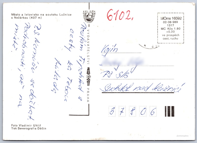 Veselí nad Lužnicí Pokud chcete vidět pohlednice ve vyšším rozlišení nebo zobrazovat jejich zadní stranu, tak se prosím nejdříve přihlašte Přihlásit Zaregistrovat Veselí nad Lužnicí Město a letovisko na soutoku Lužnice s Nežárkou (407 m) Jazyk tištěného textu na pohlednici: čeština Veselí nad Lužnicí I, Veselí nad Lužnicí, Tábor ukázat na mapě Vydavatel: PressFoto Praha (Československo) Rok vydání pohlednice: 1989 Velikost (š x v) a tvar pohlednice: 146 x 105 mm (5.75" x 4.13"), obdélník Osoby spjaté s touto pohlednicí: Vladimír Uhlíř(Autor fotografie) Prošlá poštou Ceny: Cena pohlednice: 1,80 Kčs (CSK) (+0,20 Kčs přípl. na tur. ruch) Kódy na pohlednici: MOms 16592 02-08-989 1317 DiskuseVložit příspěvek Přidat novou složku ... Spravovat složky ...