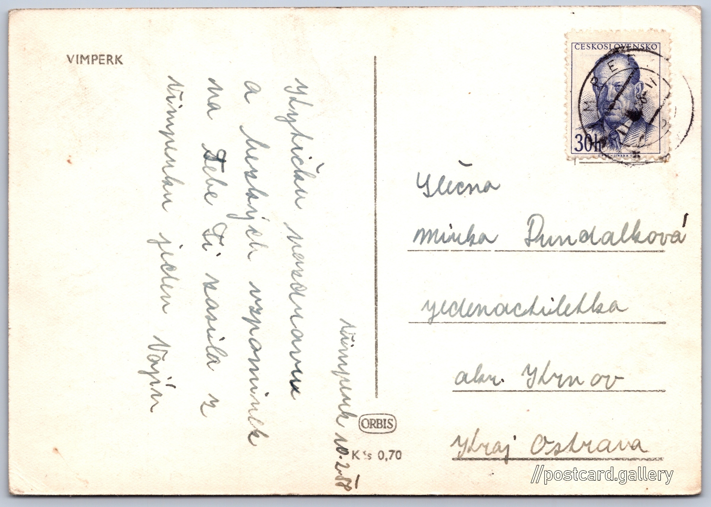 Vimperk, celkový pohled Pokud chcete vidět pohlednice ve vyšším rozlišení nebo zobrazovat jejich zadní stranu, tak se prosím nejdříve přihlašte Přihlásit Zaregistrovat VIMPERK Jazyk tištěného textu na pohlednici: čeština Svornosti 103/6, Vimperk, 385 01, Prachatice ukázat na mapě Vydavatel: Nakladatelství Orbis (Československo) Odhadované datum vydání pohlednice: 1955 - 1958 Pomozte nám zpřesnit rok vzniku pohlednice Velikost (š x v) a tvar pohlednice: 147 x 103 mm (5.79" x 4.06"), obdélník Prošlá poštou:Datum na razítku: 10.2.1958Datum napsání pohledu: 10.2.1958 Ceny: Cena pohlednice: 0,70 Kčs (CSK)Vyplacené známky: 0,20 Kčs (CSK) DiskuseVložit příspěvek Přidat novou složku ... Spravovat složky ...