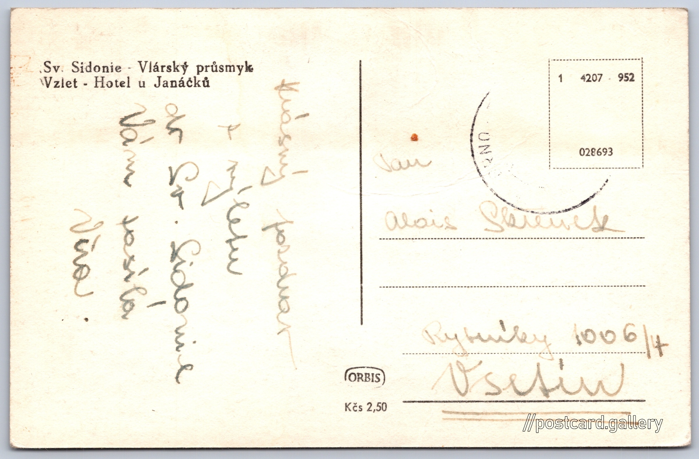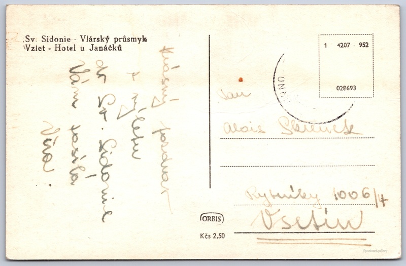 Vlárský průsmyk, hotel u Janáčků Pokud chcete vidět pohlednice ve vyšším rozlišení nebo zobrazovat jejich zadní stranu, tak se prosím nejdříve přihlašte Přihlásit Zaregistrovat Sv. Sidonie - Vlárský průsmykVzlet - Hotel u Janáčků Jazyk tištěného textu na pohlednici: čeština Sidonie, Část obce, Brumov-Bylnice, Česko ukázat na mapě Přesné místo není známo. Pokud jej znáte, tak jej prosím napište do komentářů nebo označte na mapě Vydavatel: Nakladatelství Orbis (Československo) Rok vydání pohlednice: září, 1952 Velikost (š x v) a tvar pohlednice: 137 x 89 mm (5.39" x 3.50"), obdélník Prošlá poštou Ceny: Cena pohlednice: 2,50 Kčs (CSK) Kódy na pohlednici: 1 4207-952 028693 DiskuseVložit příspěvek Přidat novou složku ... Spravovat složky ...