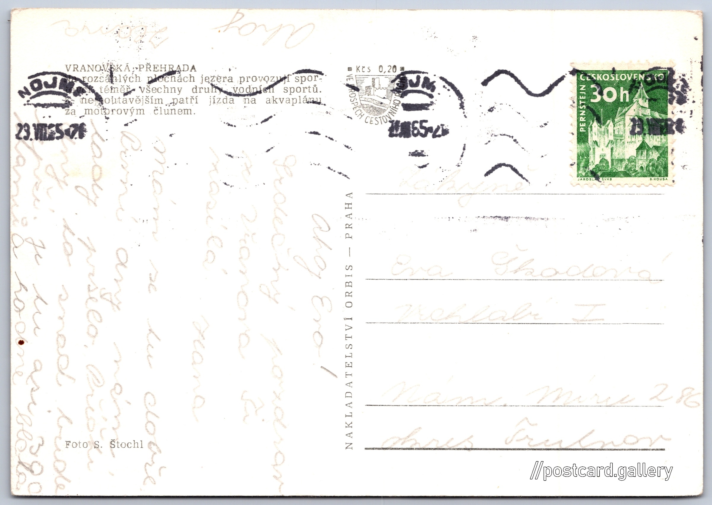 Vranovská přehrada, vodní lyžování Pokud chcete vidět pohlednice ve vyšším rozlišení nebo zobrazovat jejich zadní stranu, tak se prosím nejdříve přihlašte Přihlásit Zaregistrovat VRANOVSKÁ PŘEHRADANa rozsáhlých plochách jezera provozu sportovci téměř všechny druh vodních sportů. K nejpoutavějším patří jízda na akvaplánu za motorovým člunem. Jazyk tištěného textu na pohlednici: čeština Vranov nad Dyjí, Znojmo ukázat na mapě Vydavatel: Nakladatelství Orbis (Československo) Odhadované datum vydání pohlednice: 1962 - 1965 Pomozte nám zpřesnit rok vzniku pohlednice Velikost (š x v) a tvar pohlednice: 146 x 102 mm (5.75" x 4.02"), obdélník Osoby spjaté s touto pohlednicí: Sláva Štochl(Autor fotografie) Prošlá poštou:Datum na razítku: 23.7.1965 Ceny: Příplatek na tur. ruch: 0,20 Kčs (CSK))Vyplacené známky: 0,30 Kčs (CSK) DiskuseVložit příspěvek Přidat novou složku ... Spravovat složky ...