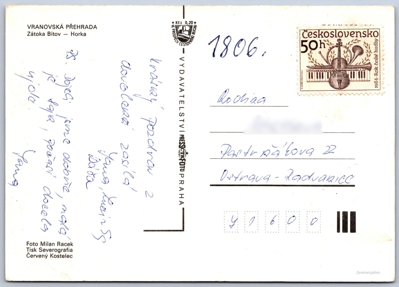 Vranovská přehrada Pokud chcete vidět pohlednice ve vyšším rozlišení nebo zobrazovat jejich zadní stranu, tak se prosím nejdříve přihlašte Přihlásit Zaregistrovat Vranovská přehrada VRANOVSKÁ PŘEHRADAZátoka Bítov - Horka Jazyk tištěného textu na pohlednici: čeština Bítov, Znojmo ukázat na mapě Vydavatel: PressFoto Praha (Československo) Odhadované datum vydání pohlednice: 1982 - 1984 Pomozte nám zpřesnit rok vzniku pohlednice Velikost (š x v) a tvar pohlednice: 148 x 105 mm (5.83" x 4.13"), obdélník Osoby spjaté s touto pohlednicí: Milan Racek(Autor fotografie) Prošlá poštou Ceny: Příplatek na tur. ruch: 0,20 Kčs (CSK))Vyplacené známky: 0,50 Kčs (CSK) DiskuseVložit příspěvek Přidat novou složku ... Spravovat složky ...