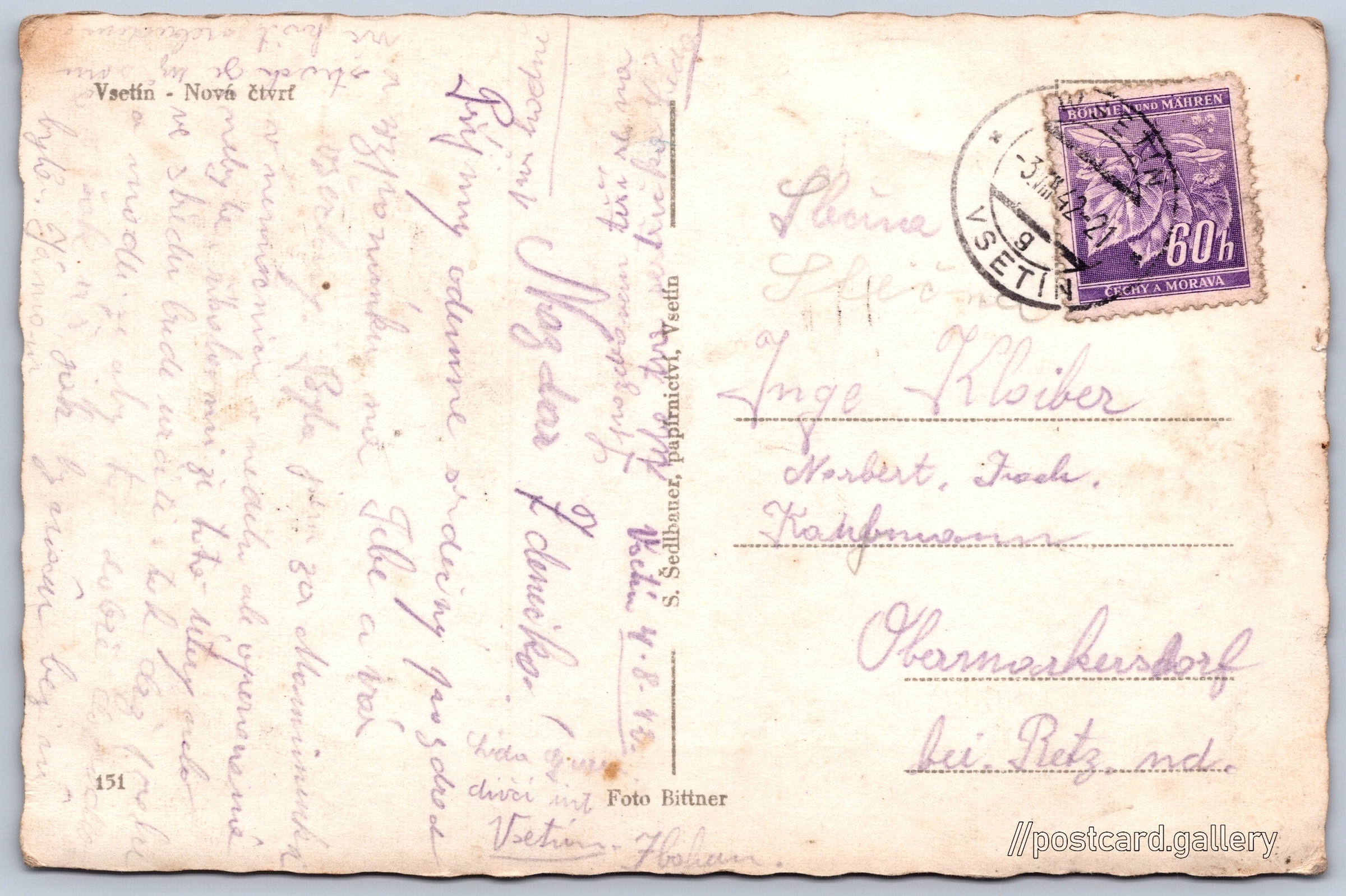 Vsetín, nová čtvrť Pokud chcete vidět pohlednice ve vyšším rozlišení nebo zobrazovat jejich zadní stranu, tak se prosím nejdříve přihlašte Přihlásit Zaregistrovat Vsetín - Nová čtvrť Jazyk tištěného textu na pohlednici: angličtina Sušilova 1330, Vsetín, 755 01, Vsetín ukázat na mapě V blízkém okolí místa zobrazeného na pohlednici lze najít 4 jiné pohlednice. Zobrazit blízké pohlednice Odhadované datum vydání pohlednice: 1939 - 1942 Pomozte nám zpřesnit rok vzniku pohlednice Velikost (š x v) a tvar pohlednice: 140 x 93 mm (5.51" x 3.66"), obdélník, zoubkovaný Prošlá poštou:Datum na razítku: 3.8.1942Datum napsání pohledu: 4.8.1942 Ceny: Vyplacené známky: 0,60 Kčs (CSK) Kódy na pohlednici: 151 DiskuseVložit příspěvek Přidat novou složku ... Spravovat složky ...