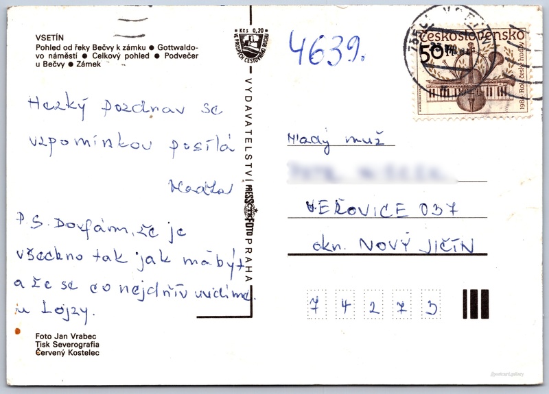 Vsetín Pokud chcete vidět pohlednice ve vyšším rozlišení nebo zobrazovat jejich zadní stranu, tak se prosím nejdříve přihlašte Přihlásit Zaregistrovat Vsetín VSETÍN- Pohled od řeky Bečvy k zámku- Gottwaldovo náměstí- Celkový pohled- Podvečer u Bečvy- Zámek Jazyk tištěného textu na pohlednici: čeština Mostecká, Vsetín, Vsetín ukázat na mapě Vydavatel: PressFoto Praha (Československo) Datum vydání není známo Pomozte nám odhadnout datum vzniku pohlednice Velikost (š x v) a tvar pohlednice: 148 x 105 mm (5.83" x 4.13"), obdélník Osoby spjaté s touto pohlednicí: Klement Gottwald(Jméno v názvu místa) Jan Vrabec(Autor fotografie) Prošlá poštou Ceny: Příplatek na tur. ruch: 0,20 Kčs (CSK))Vyplacené známky: 0,50 Kčs (CSK) DiskuseVložit příspěvek Přidat novou složku ... Spravovat složky ...
