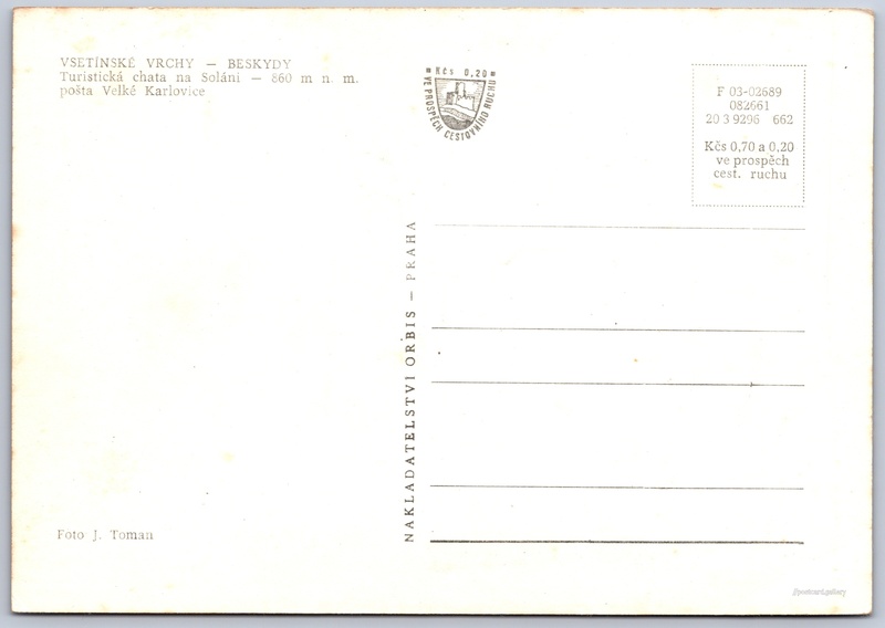 Vsetínské vrchy, chata Soláň Pokud chcete vidět pohlednice ve vyšším rozlišení nebo zobrazovat jejich zadní stranu, tak se prosím nejdříve přihlašte Přihlásit Zaregistrovat VSETÍNSKÉ VRCHY - BESKYDYTuristická chata na Soláni - 860 m n. m.pošta Velké Karlovice Jazyk tištěného textu na pohlednici: čeština Velké Karlovice 621, Velké Karlovice, 756 06, Vsetín ukázat na mapě V blízkém okolí místa zobrazeného na pohlednici lze najít 3 jiné pohlednice. Zobrazit blízké pohlednice Vydavatel: Nakladatelství Orbis (Československo) Rok vydání pohlednice: červen, 1962 Velikost (š x v) a tvar pohlednice: 146 x 102 mm (5.75" x 4.02"), obdélník Osoby spjaté s touto pohlednicí: J. H. Toman(Autor fotografie) Čistá pohlednice (neprošlá poštou) Ceny: Cena pohlednice: 0,70 Kčs (CSK) (+0,20 Kčs přípl. na tur. ruch) Kódy na pohlednici: F 03-02689 082661 20 3 9296 662 DiskuseVložit příspěvek Přidat novou složku ... Spravovat složky ...