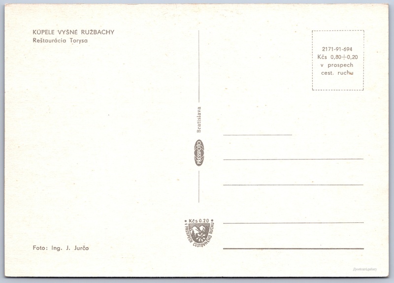 Vyšné Ružbachy, restaurace Torysa 2/6 Pokud chcete vidět pohlednice ve vyšším rozlišení nebo zobrazovat jejich zadní stranu, tak se prosím nejdříve přihlašte Přihlásit Zaregistrovat KÚPELE VYŠNÉ RUŽBACHYReštaurácia Torysa Jazyk tištěného textu na pohlednici: slovenština Vyšné Ružbachy ukázat na mapě V blízkém okolí místa zobrazeného na pohlednici lze najít 6 jiných pohlednic. Zobrazit blízké pohlednice Vydavatel: PressFoto Bratislava (Československo) Datum vydání není známo Pomozte nám odhadnout datum vzniku pohlednice Velikost (š x v) a tvar pohlednice: 148 x 105 mm (5.83" x 4.13"), obdélník Osoby spjaté s touto pohlednicí: Ing. J. Jurčo(Autor fotografie) Čistá pohlednice (neprošlá poštou) Ceny: Cena pohlednice: 0,80 Kčs (CSK) (+0,20 Kčs přípl. na tur. ruch) Kódy na pohlednici: 2171-91-694 DiskuseVložit příspěvek Přidat novou složku ... Spravovat složky ...