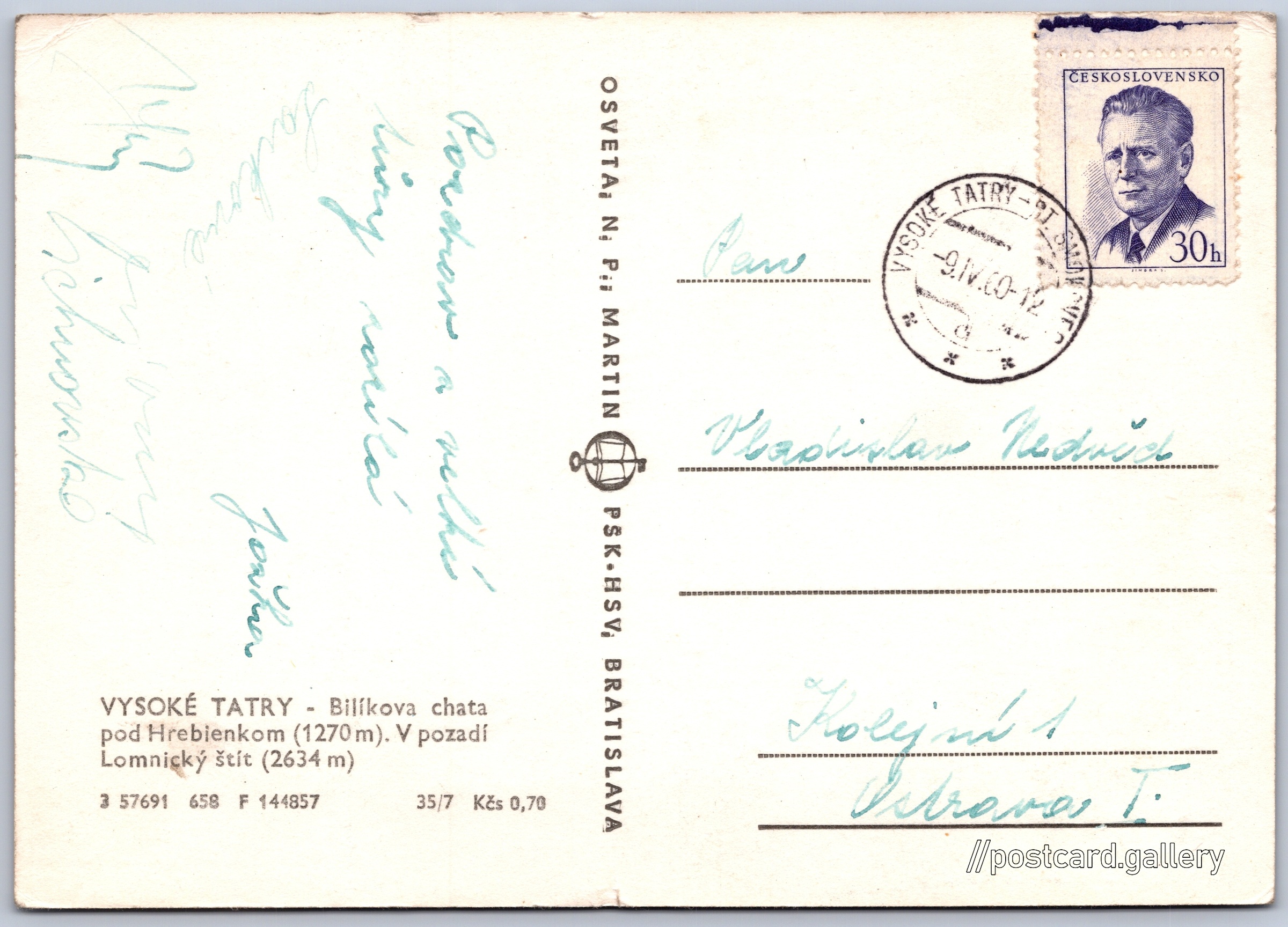 Vysoké Tatry, Bilíkova chata Pokud chcete vidět pohlednice ve vyšším rozlišení nebo zobrazovat jejich zadní stranu, tak se prosím nejdříve přihlašte Přihlásit Zaregistrovat VYSOKÉ TATRY - Bilíkova chata pod Hrebienkom (1270 m). V pozadíLomnický štít (2634 m). Jazyk tištěného textu na pohlednici: slovenština Bilíkova chata, Chata, bouda, Tatranská Lomnica 14, Vysoké Tatry - Tatranská Lomnica, Slovensko ukázat na mapě V blízkém okolí místa zobrazeného na pohlednici lze najít 143 jiných pohlednic. Zobrazit blízké pohlednice Vydavatel: Osveta, n. p., Martin PŠK - Bratislava (Československo) Rok vydání pohlednice: červen, 1958 Velikost (š x v) a tvar pohlednice: 147 x 103 mm (5.79" x 4.06"), obdélník Prošlá poštou:Datum na razítku: 9.4.1960 Ceny: Cena pohlednice: 0,70 Kčs (CSK)Vyplacené známky: 0,30 Kčs (CSK) Kódy na pohlednici: 3 57691 658 F 144857 35/7 DiskuseVložit příspěvek Přidat novou složku ... Spravovat složky ...
