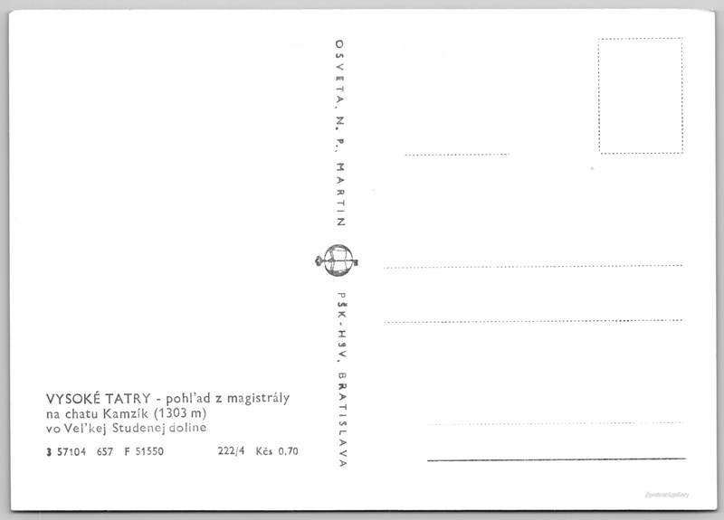 Vysoké Tatry, chata Kamzík z magistrály Pokud chcete vidět pohlednice ve vyšším rozlišení nebo zobrazovat jejich zadní stranu, tak se prosím nejdříve přihlašte Přihlásit Zaregistrovat VYSOKÉ TATRY - pohľ’ad z magistrály na chatu Kamzík (1303 m) vo Vel'kej Studenej doline Jazyk tištěného textu na pohlednici: slovenština Tatranská Lomnica ukázat na mapě V blízkém okolí místa zobrazeného na pohlednici lze najít 159 jiných pohlednic. Zobrazit blízké pohlednice Vydavatel: Osveta, n. p., Martin PŠK - Bratislava (Československo) Rok vydání pohlednice: červen, 1957 Velikost (š x v) a tvar pohlednice: 147 x 104 mm (5.79" x 4.09"), obdélník Čistá pohlednice (neprošlá poštou) Ceny: Cena pohlednice: 0,70 Kčs (CSK) Kódy na pohlednici: 3 57104 657 F 51550 222/4 DiskuseVložit příspěvek Přidat novou složku ... Spravovat složky ...