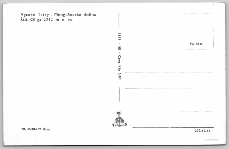Vysoké Tatry, Mengušovská dolina Pokud chcete vidět pohlednice ve vyšším rozlišení nebo zobrazovat jejich zadní stranu, tak se prosím nejdříve přihlašte Přihlásit Zaregistrovat Vysoké Tatry - Mengušovská dolinaŠtít Ol'ga 2212 m n. m. Jazyk tištěného textu na pohlednici: slovenština Mengusovská dolina, Kaňon, rokle, soutěska, údolí, Vysoké Tatry - Štrbské Pleso, Slovensko ukázat na mapě V blízkém okolí místa zobrazeného na pohlednici lze najít 110 jiných pohlednic. Zobrazit blízké pohlednice Vydavatel: Tatran (Československo) Rok vydání pohlednice: 1950 Velikost (š x v) a tvar pohlednice: 135 x 87 mm (5.31" x 3.43"), obdélník Čistá pohlednice (neprošlá poštou) Ceny: Cena pohlednice: 2,50 Kčs (CSK) Kódy na pohlednici: 20-19-804 Mišk.or 3399-50 FB 4526 270-12-10 DiskuseVložit příspěvek Přidat novou složku ... Spravovat složky ...