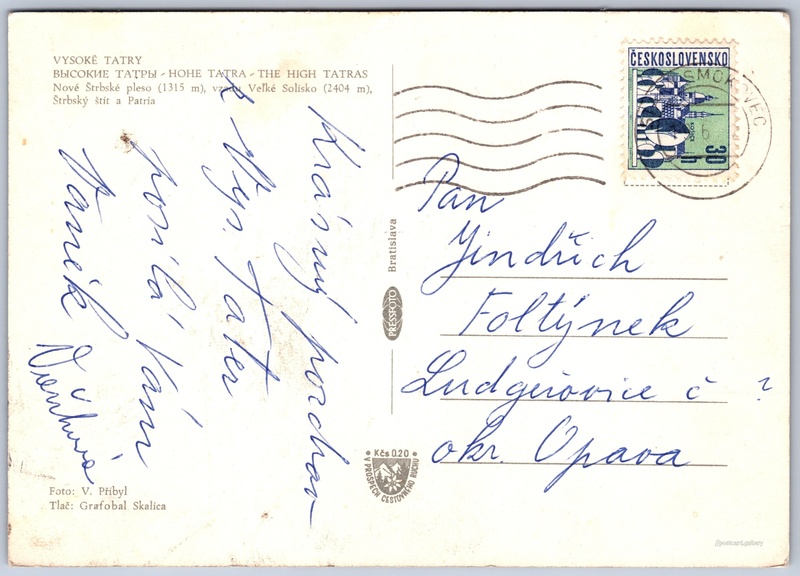 Vysoké Tatry, Nové Štrbské pleso Pokud chcete vidět pohlednice ve vyšším rozlišení nebo zobrazovat jejich zadní stranu, tak se prosím nejdříve přihlašte Přihlásit Zaregistrovat VYSOKÉ TATRYВЫСОКИЕ ТАТРЫ - НОHE TATRA - THE HIGH TATRASNové Štrbské pleso (1315 m), vzadu Veľké Solisko (2404 m), Štrbský štít a Patria Jazyk tištěného textu na pohlednici: slovenština Nové Štrbské pleso, Vodní plocha, Štrba, Slovensko ukázat na mapě V blízkém okolí místa zobrazeného na pohlednici lze najít 109 jiných pohlednic. Zobrazit blízké pohlednice Vydavatel: PressFoto Bratislava (Československo) Datum vydání není známo Pomozte nám odhadnout datum vzniku pohlednice Velikost (š x v) a tvar pohlednice: 148 x 105 mm (5.83" x 4.13"), obdélník Osoby spjaté s touto pohlednicí: V. Přibyl(Autor fotografie) Prošlá poštou Ceny: Příplatek na tur. ruch: 0,20 Kčs (CSK))Vyplacené známky: 0,30 Kčs (CSK) DiskuseVložit příspěvek Přidat novou složku ... Spravovat složky ...