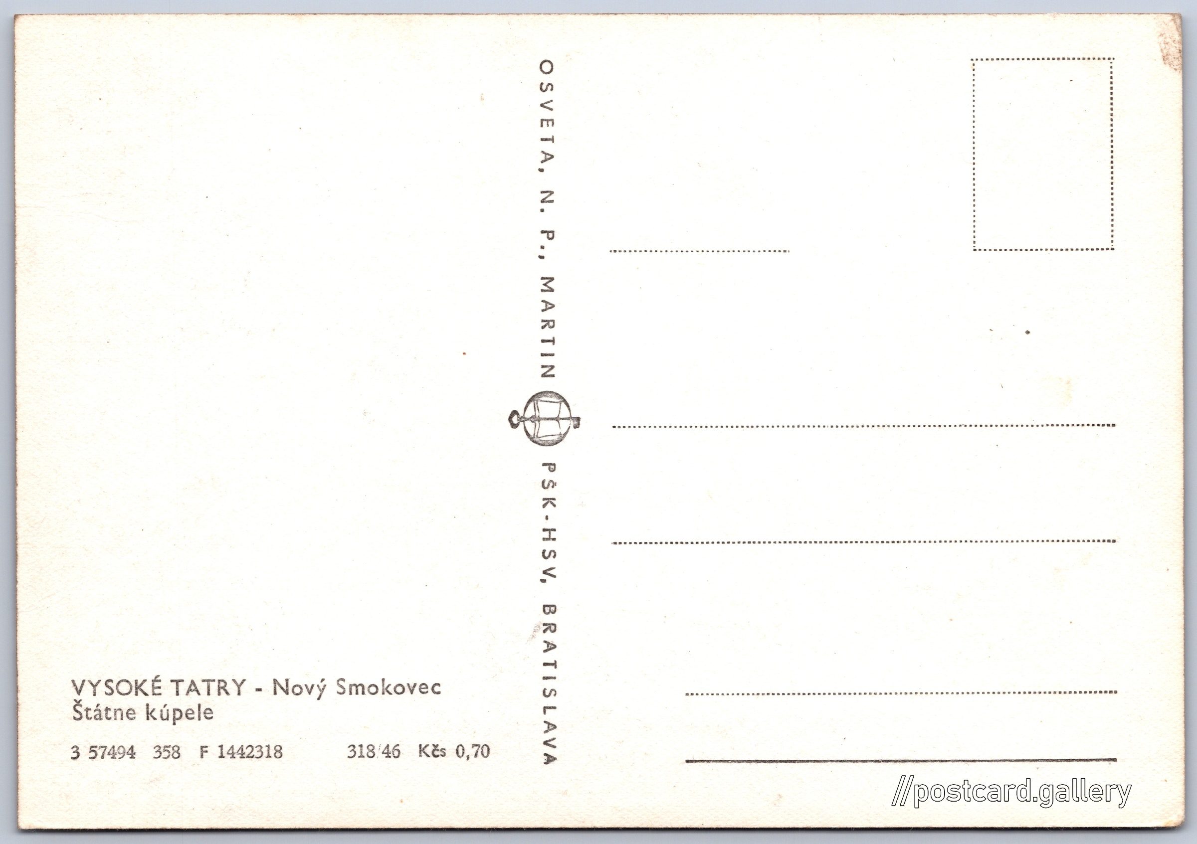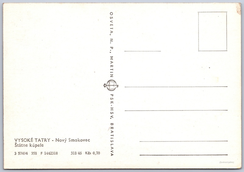 Vysoké Tatry, Nový Smokovec, lázně Pokud chcete vidět pohlednice ve vyšším rozlišení nebo zobrazovat jejich zadní stranu, tak se prosím nejdříve přihlašte Přihlásit Zaregistrovat VYSOKÉ TATRY - Nový SmokovecŠtátne kúpele Jazyk tištěného textu na pohlednici: slovenština Starý Smokovec ukázat na mapě V blízkém okolí místa zobrazeného na pohlednici lze najít 61 jiných pohlednic. Zobrazit blízké pohlednice Vydavatel: Osveta, n. p., Martin PŠK - Bratislava (Československo) Rok vydání pohlednice: březen, 1958 Velikost (š x v) a tvar pohlednice: 146 x 101 mm (5.75" x 3.98"), obdélník Čistá pohlednice (neprošlá poštou) Ceny: Cena pohlednice: 0,70 Kčs (CSK) Kódy na pohlednici: 3 57494 358 F 1442318 318/46 DiskuseVložit příspěvek Přidat novou složku ... Spravovat složky ...