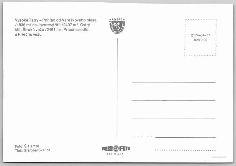 Vysoké Tatry, pohled od Vareškového plesa 2/141 Pokud chcete vidět pohlednice ve vyšším rozlišení nebo zobrazovat jejich zadní stranu, tak se prosím nejdříve přihlašte Přihlásit Zaregistrovat Vysoké Tatry Vysoké Tatry - Pohľad od Vareškového plesa /1836 m/ na Javorový štít /2407 m/, Ostrý štít, Širokú vežu /2461 m/, Priečne sedlo a Priečnu vežu Jazyk tištěného textu na pohlednici: slovenština Vareškové pleso, Vodní plocha, Vysoké Tatry - Tatranská Lomnica, Slovensko ukázat na mapě V blízkém okolí místa zobrazeného na pohlednici lze najít 153 jiných pohlednic. Zobrazit blízké pohlednice Vydavatel: PressFoto Bratislava (Československo) Datum vydání není známo Pomozte nám odhadnout datum vzniku pohlednice Velikost (š x v) a tvar pohlednice: 148 x 102 mm (5.83" x 4.02"), obdélník Osoby spjaté s touto pohlednicí: Štefan Hamza(Autor fotografie) Čistá pohlednice (neprošlá poštou) Ceny: Cena pohlednice: 0,90 Kčs (CSK) (+0,20 Kčs přípl. na tur. ruch) Kódy na pohlednici: 2174-34-77 DiskuseVložit příspěvek Přidat novou složku ... Spravovat složky ...